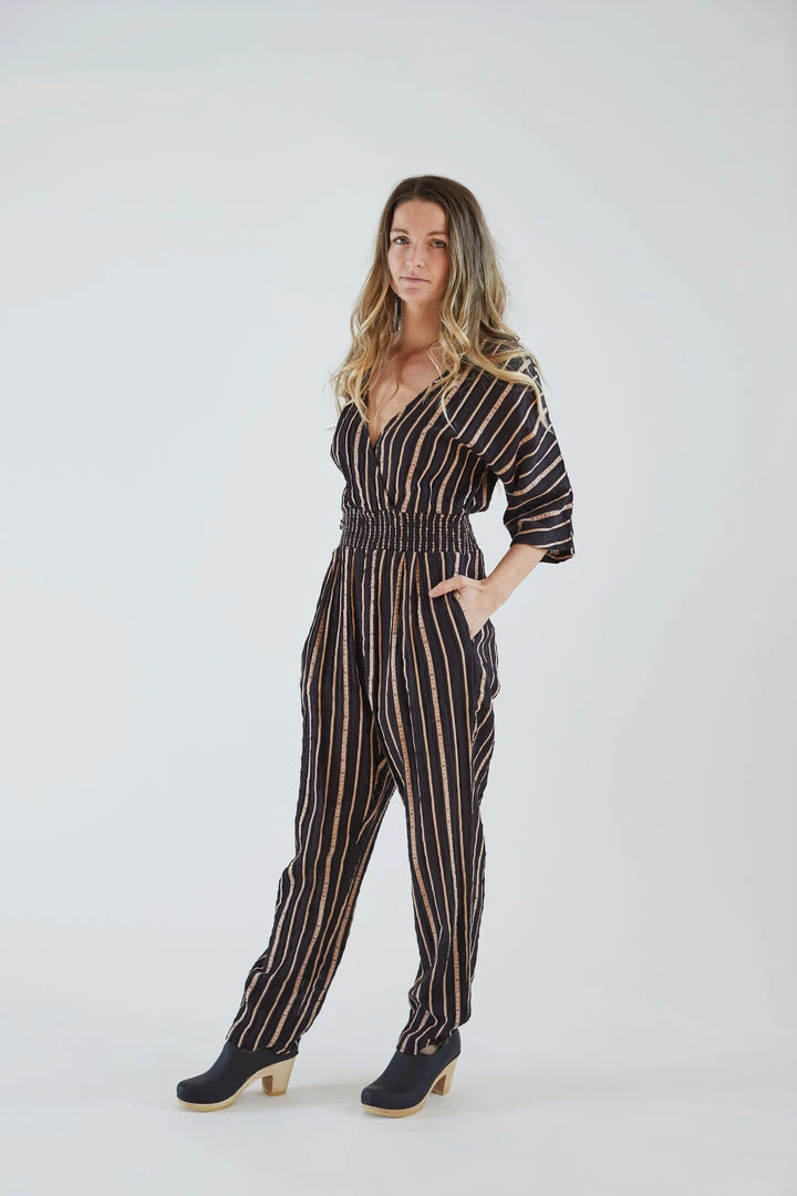 The Bianca jumpsuit is a cross front jumper with elbow length sleeves, an elasticated waist section, and a tapered leg. The textile spellbound is a lightweight black gossamer singlecloth with woven textures and