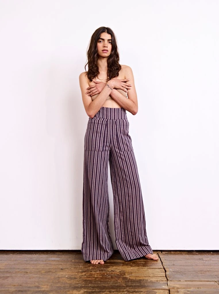A super high-waisted pant with a wide flared leg and patch pockets. Featured here in Ace & Jig’s custom yarn dye woven channel fabric, a substantial navy doublecloth with pairs of gray piping stripes.