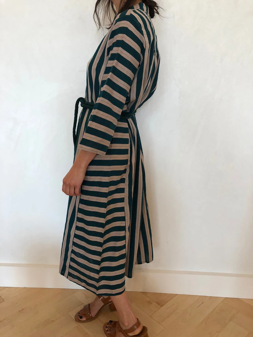 A midi length dress with 3⁄4 sleeves, a centerfront pleat, and neckline button opening. Features side gussets and a fabric rope belt.