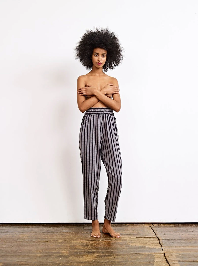 AÂ straight leg pant with an elasticated waistband and side pockets in Concrete fabric. Â Concrete is a midweight gray singlecloth with regular black stripes.