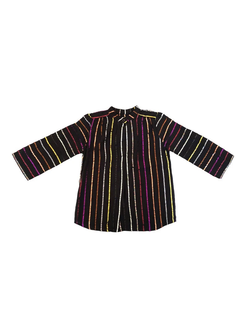 The Katherine top is a ¾ sleeve top with a center front pleat and a button collar opening in ribbon candy, a blue-black lightweight singlecloth with multicolored variegated satin stripes.