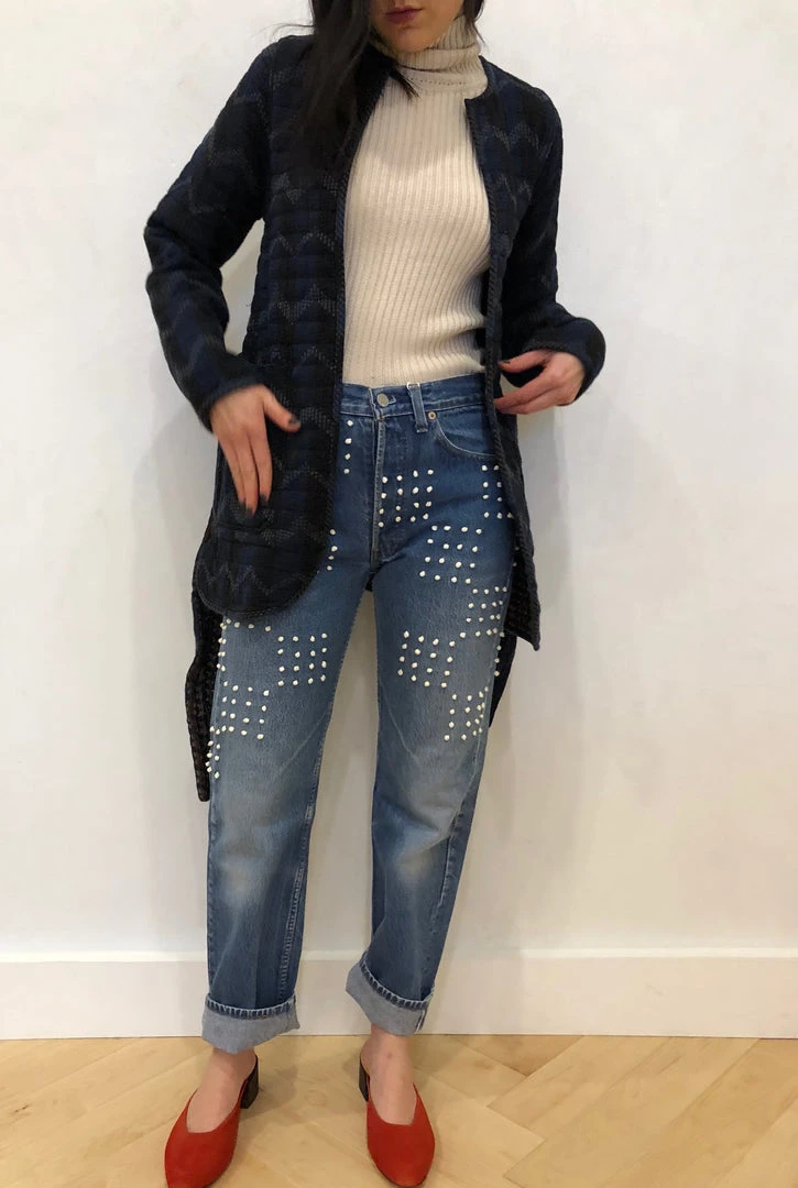 A long-sleeve fitted quilted coat with an open front and sash. Fully lined and fully reversible with patch pockets on both sides of the coat. Dusk is a mid-weight textured singlecloth of blacks, greys and navy intricate woven stripe motifs. Reverses to Calico, a supersoft, rumpled doublegauze with nude, lilac, and rust motifs atop a black ground.