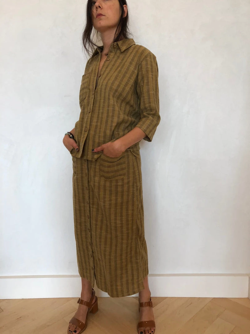 AÂ button-up stand collar shirt with three-quarter length sleeves and a front patch pocket.