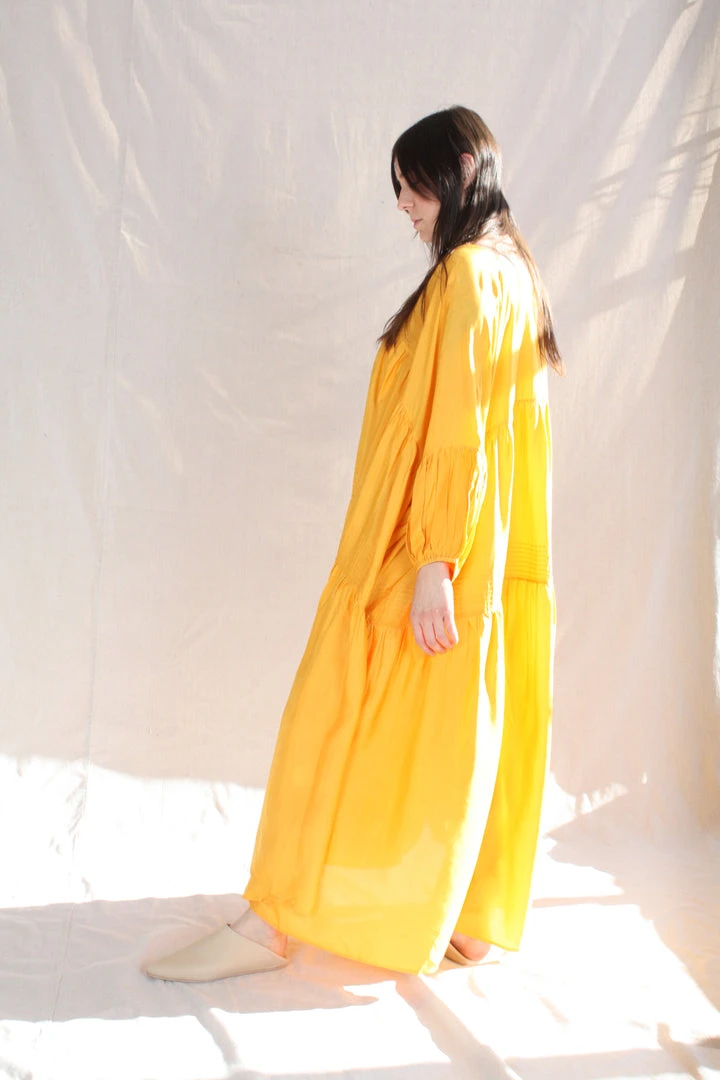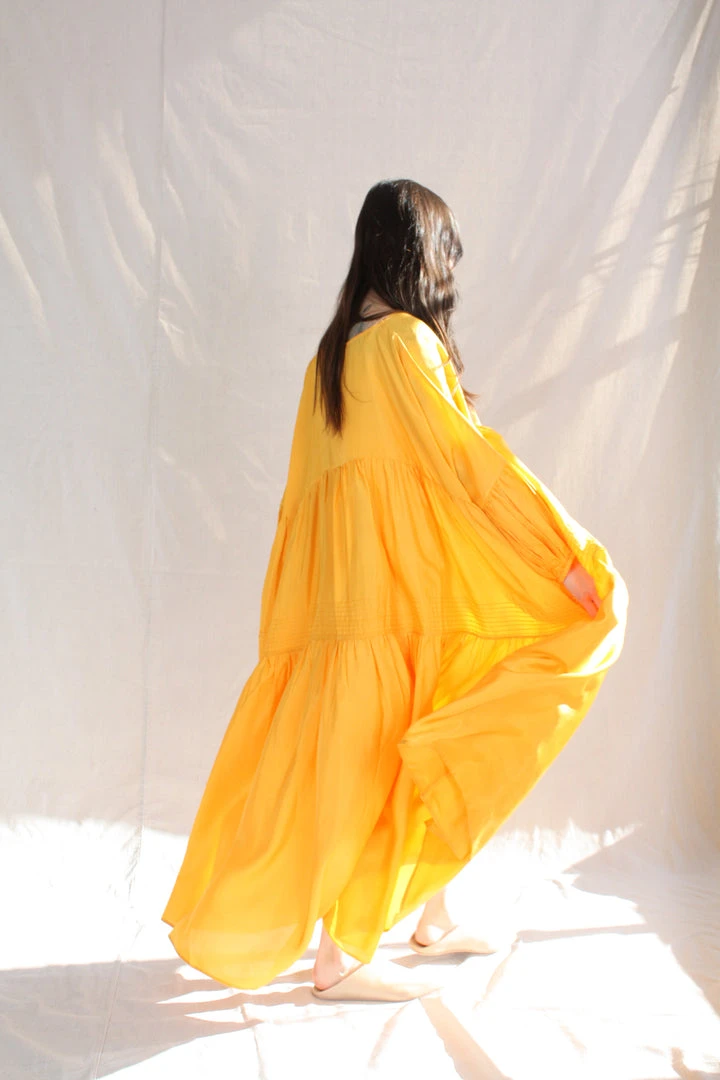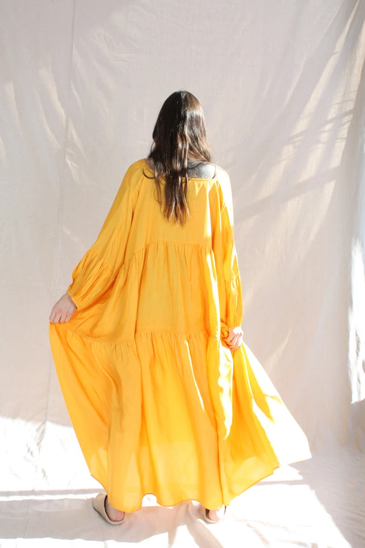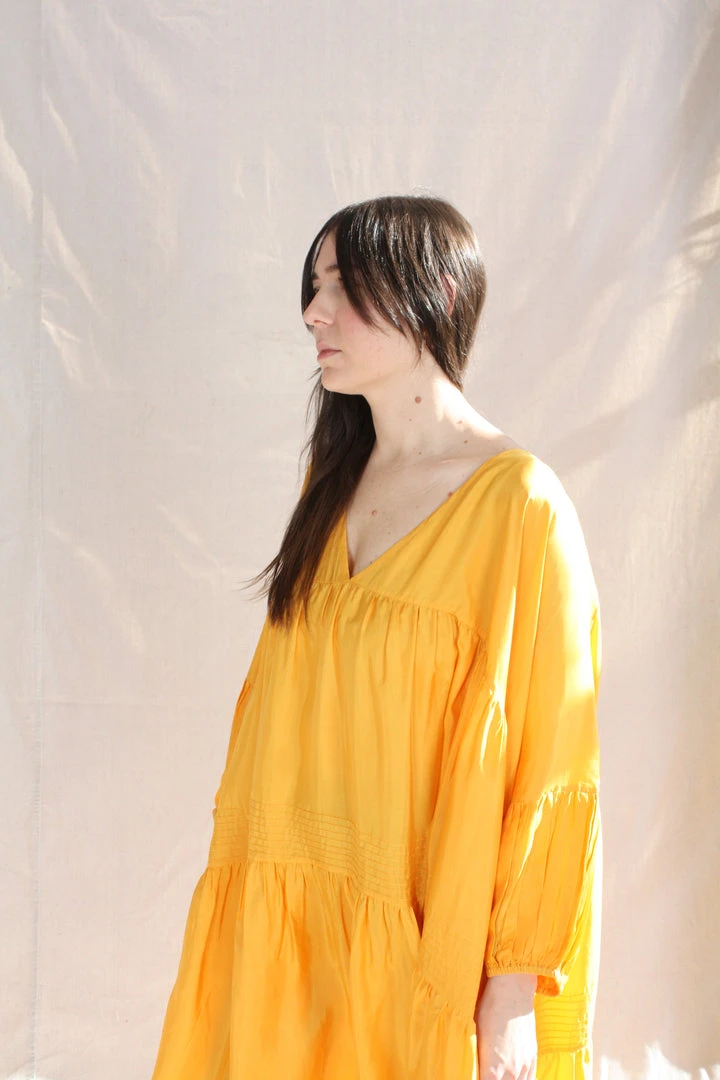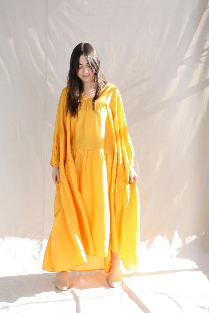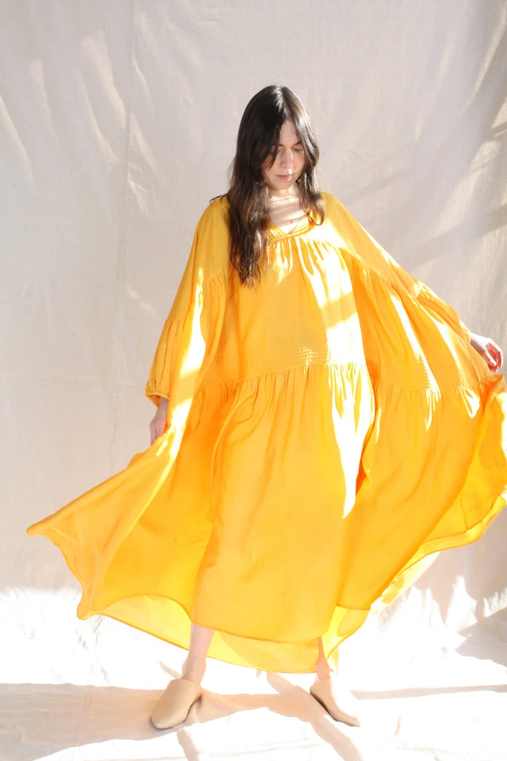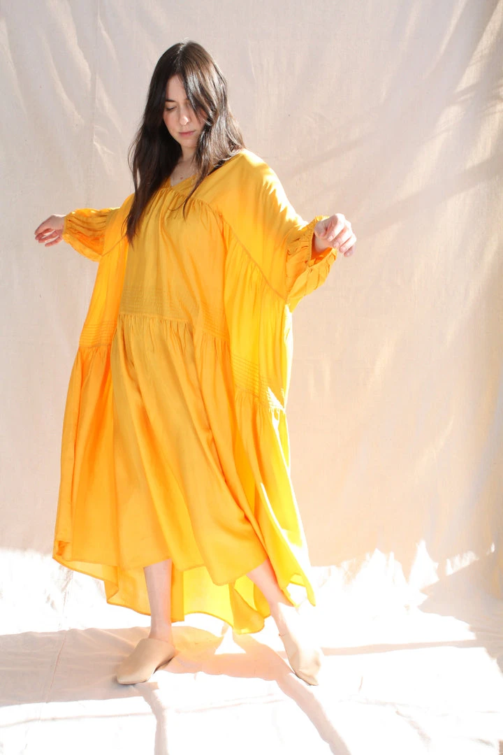 The Airi Maxi Dress billows with a deep v-neckline, 3/4 length cocoon sleeves with elastic cuffs, micro pleating detail and tiered skirt, in a in a delicious mango orange.