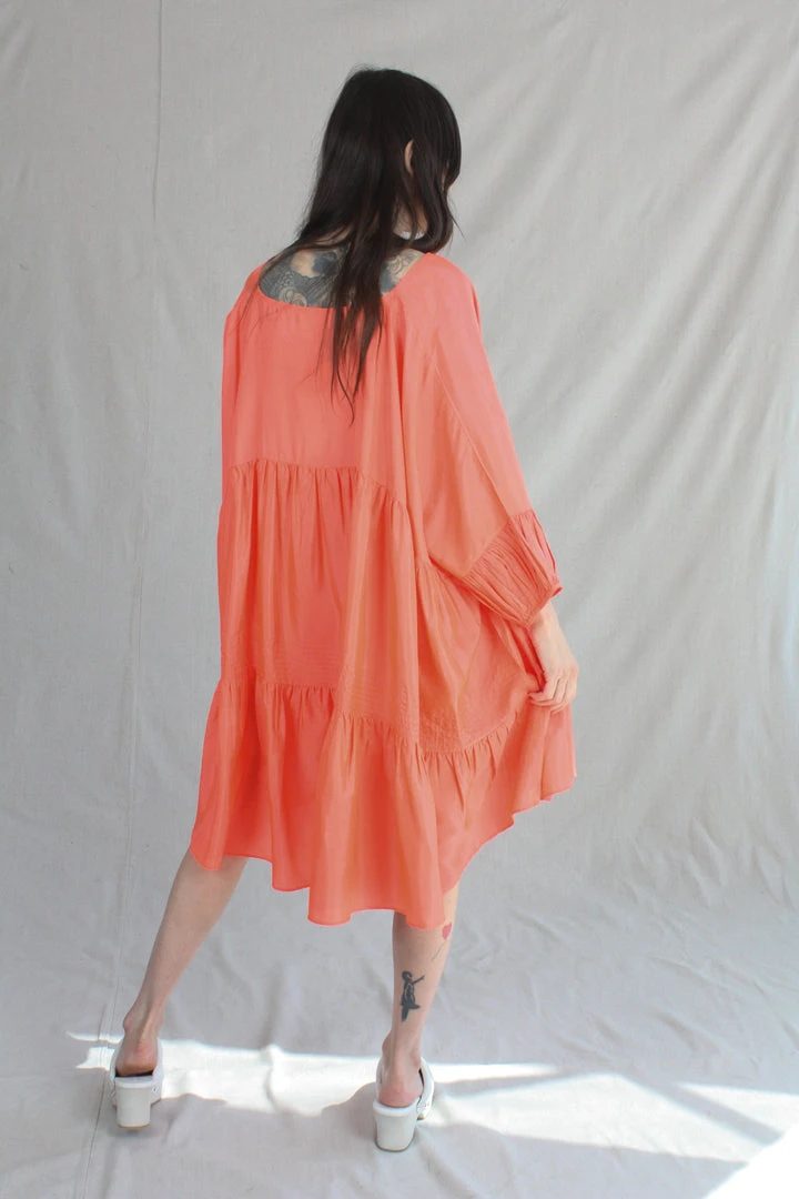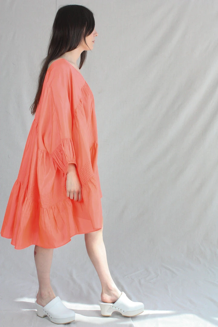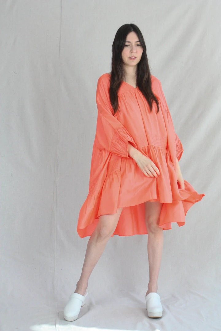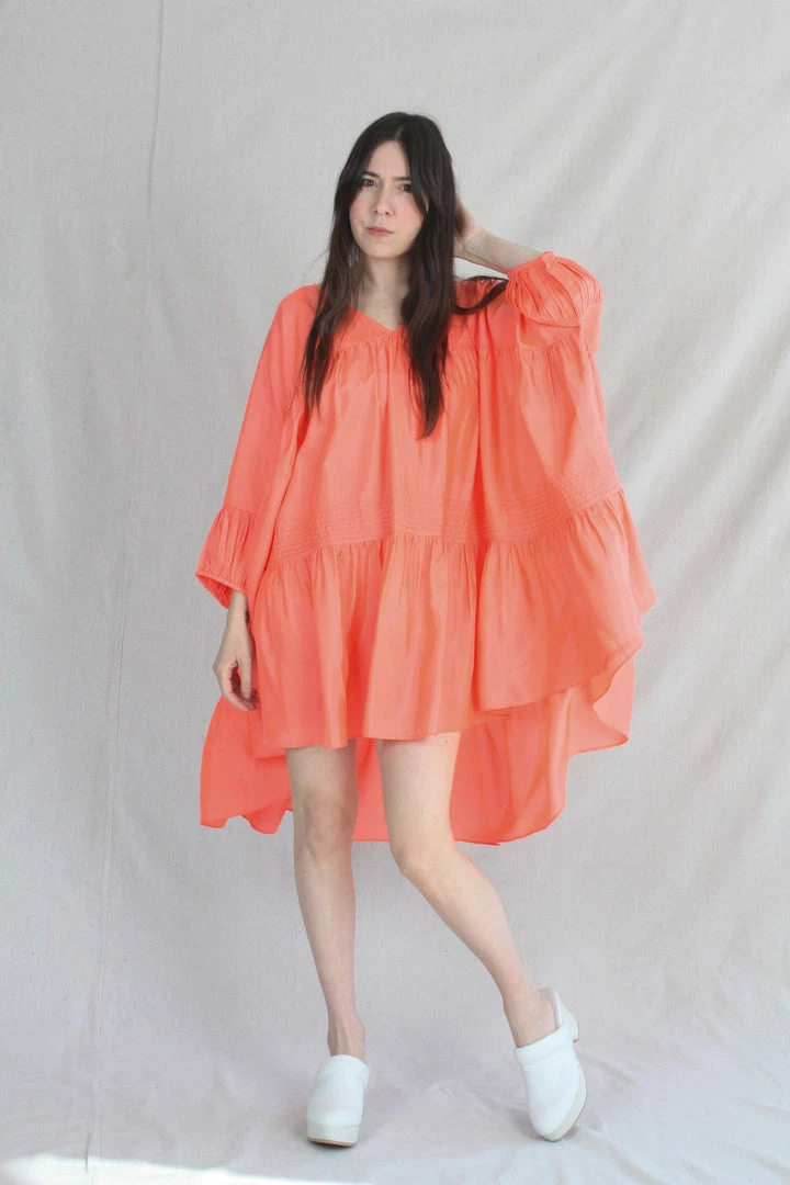 The Airi Mini Dress in a breathtaking fluorescent coral, this style has an oversized fit, but in shorter knee-length silhouette. It billows with a deep v-neckline, 3/4 length cocoon sleeves with elastic cuffs, micro pleating detail and tiered skirt.