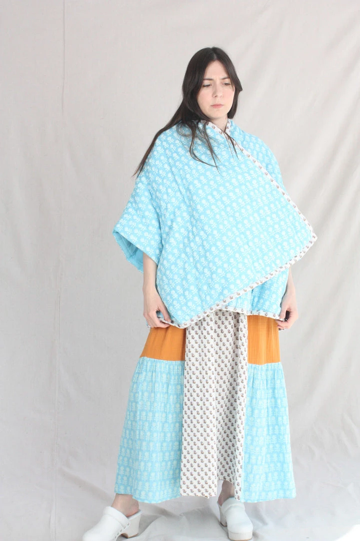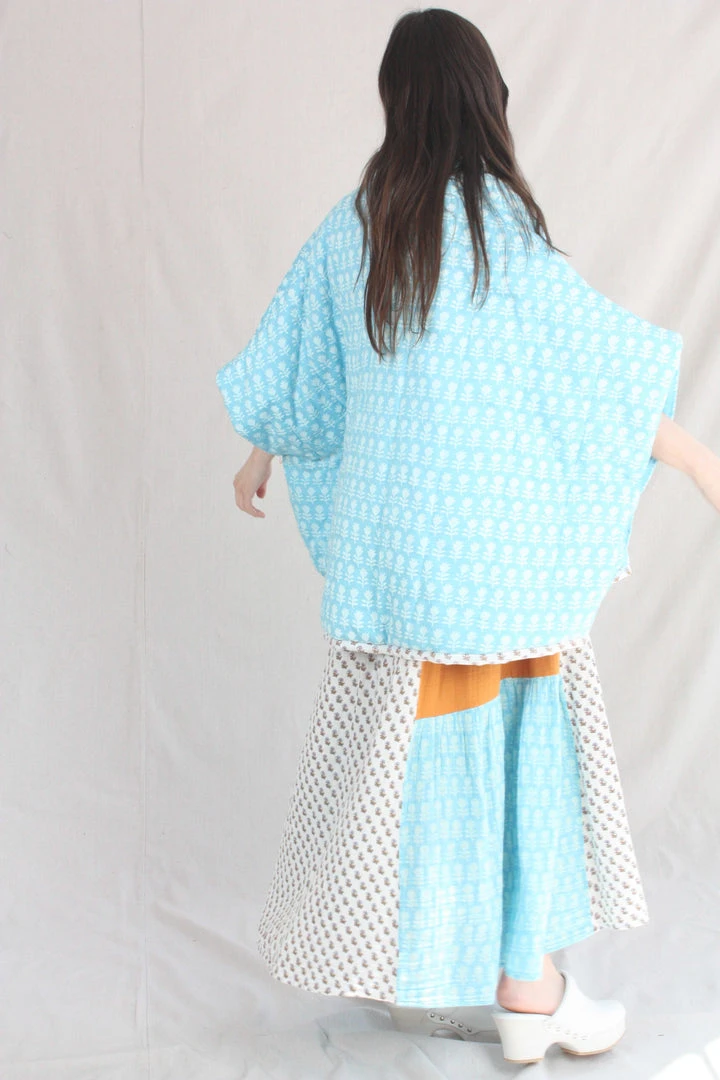 Quilted, cropped sleeve cocoon jacket in a supersoft blockprinted cotton.Â