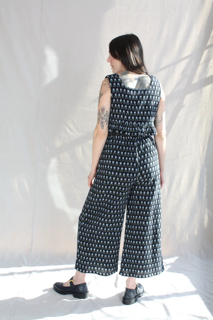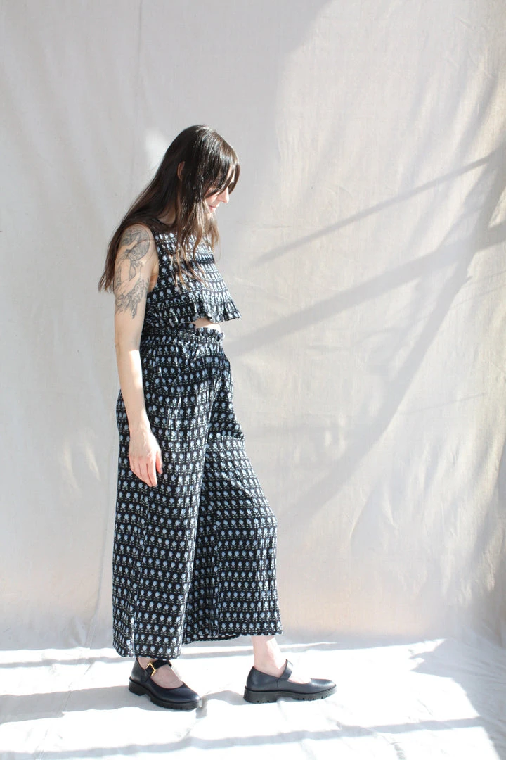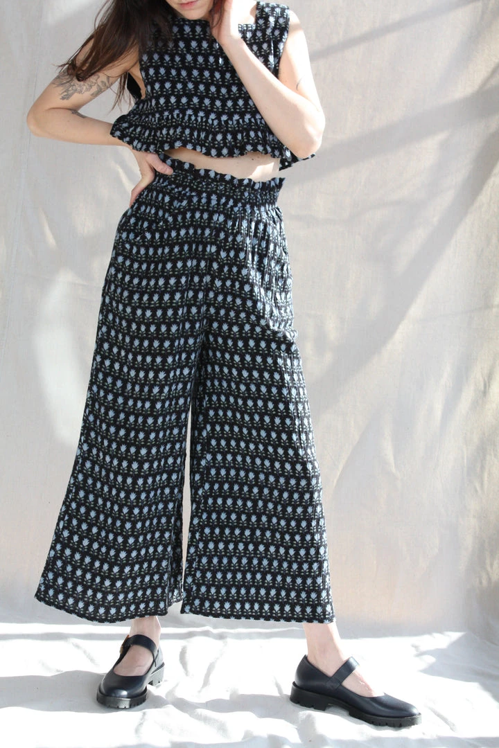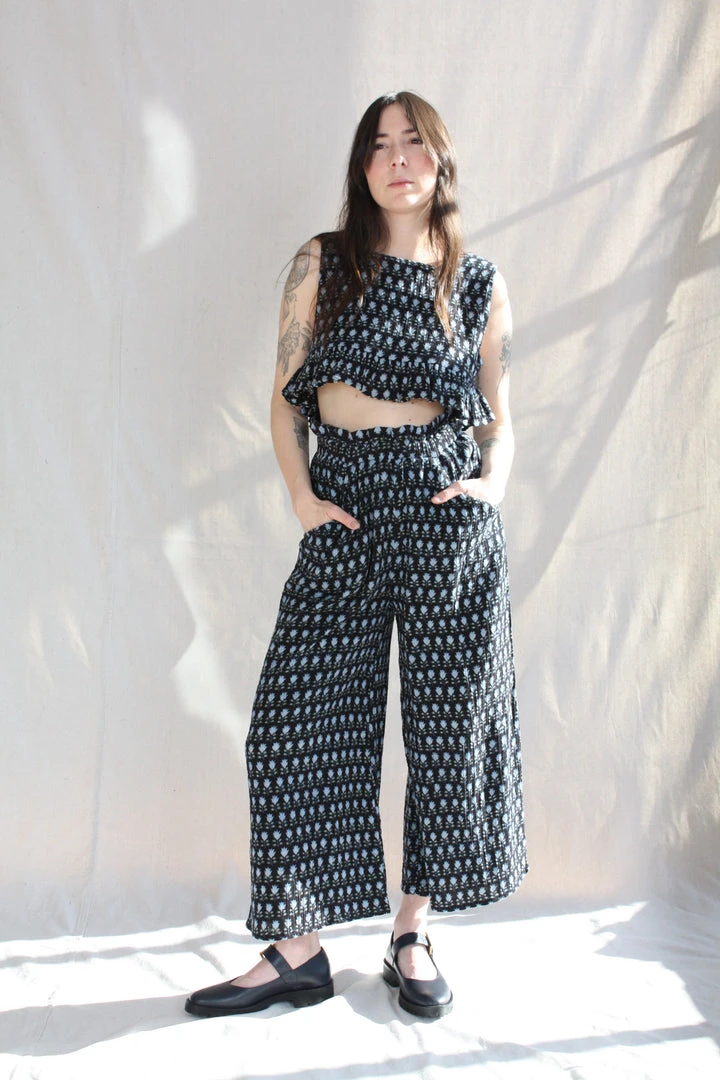 Wide leg culotte with a elastic paper bag waist in a cotton gauze block print. Dress up or down for a easy wearing.