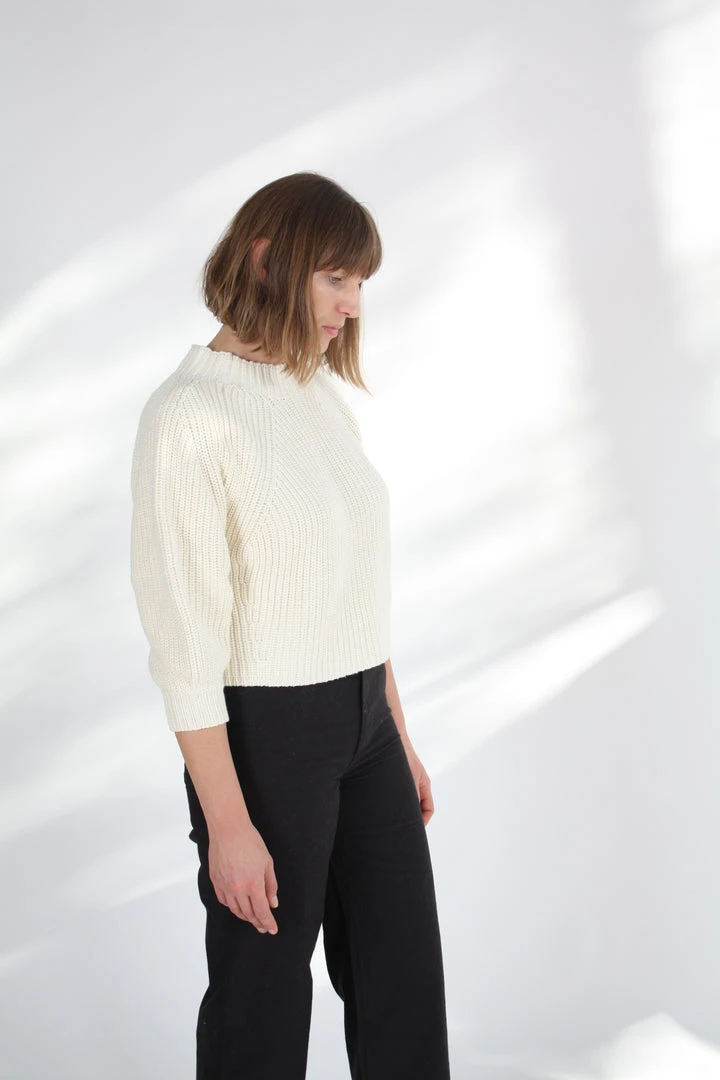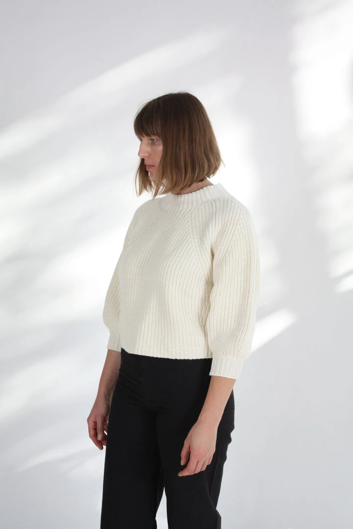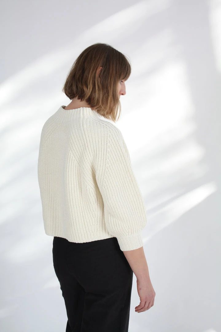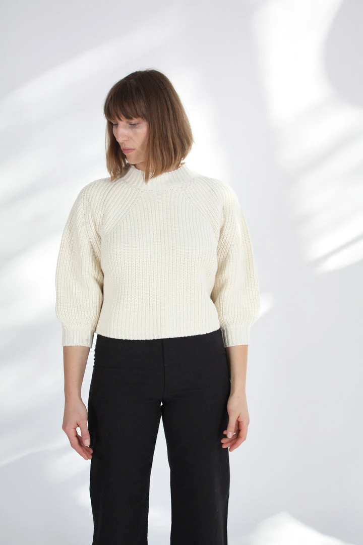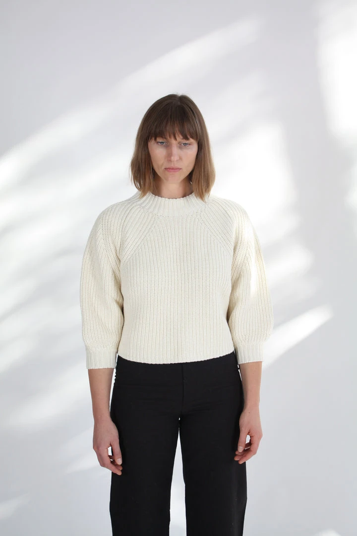 Minimal silhouette with a relaxed and cool fit. Ribbed throughout in a soft cotton-cashmere blend. Cropped length with slight puff sleeve that pushes just past the elbow.Â