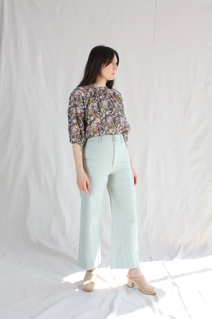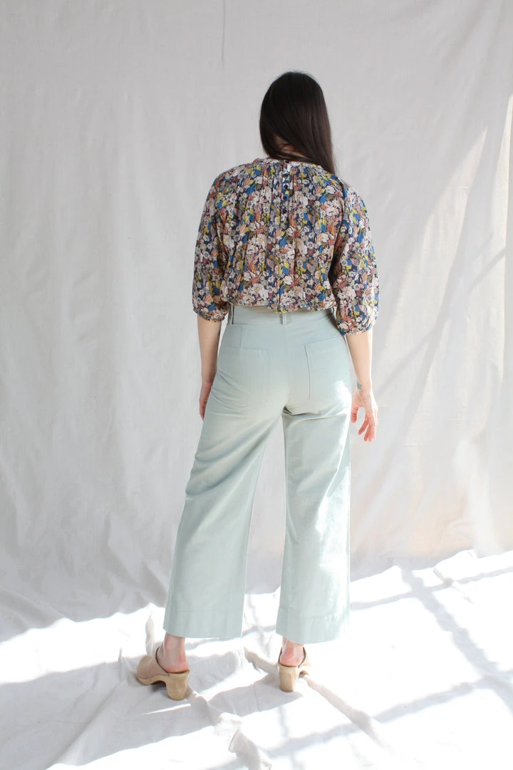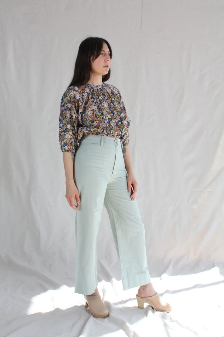 A flattering, high-rise fit, designed for repeat wear in any season. Cut from a textured cotton, with a menswear-inspired straight waistband. Classic back pockets and nearly hidden front pockets add functionality. Slight crop at the ankle, with a zipper closure and Apiece Apart’s signature double buttons. Â