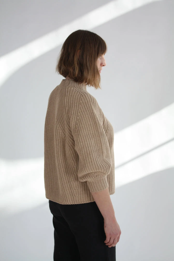 Minimal silhouette with a relaxed and cool fit. Ribbed throughout in a soft cotton-cashmere blend. Cropped length with slight puff sleeve that pushes just past the elbow.
