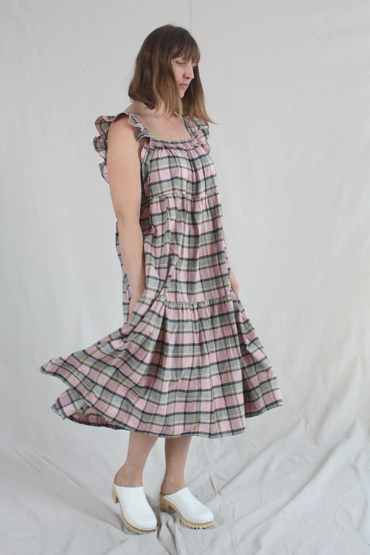 This flutter-sleeve dress has an easy, relaxed fit, midi length and a square smocked neckline with gathered tiers throughout. Cut from cool cotton in an intricately-woven Madras plaid.Â