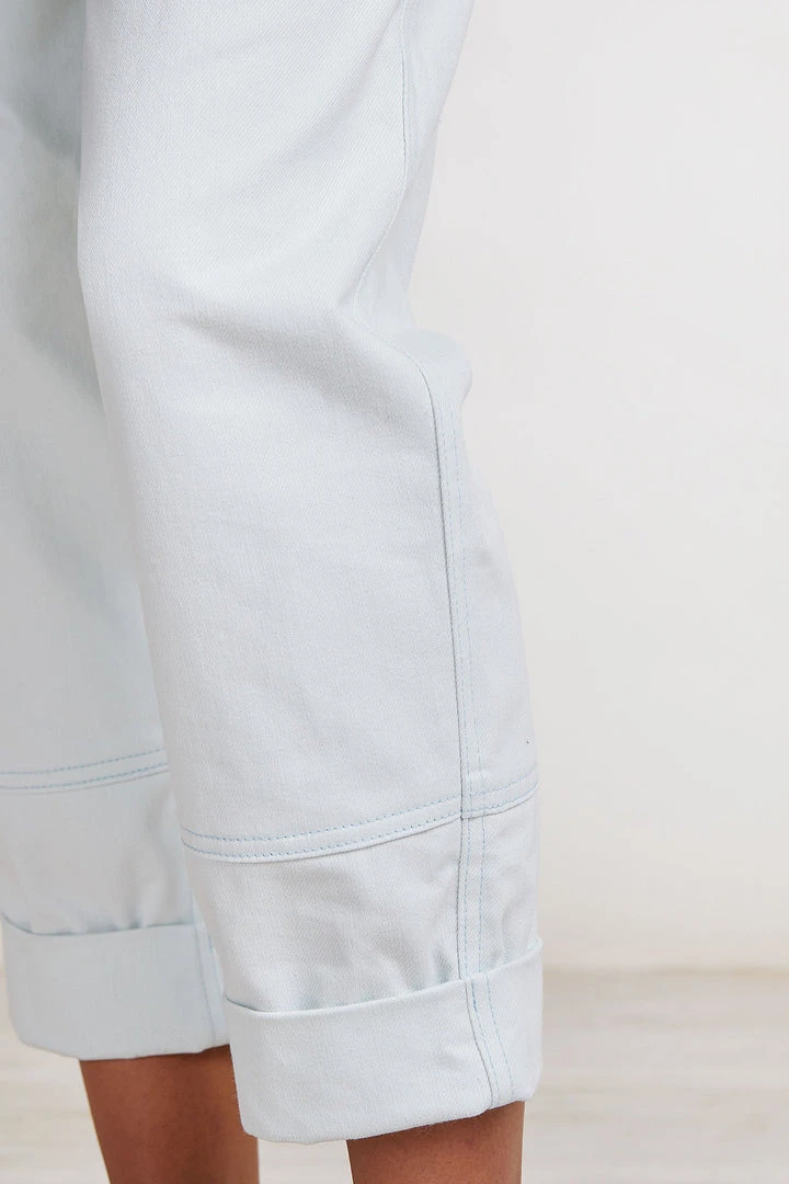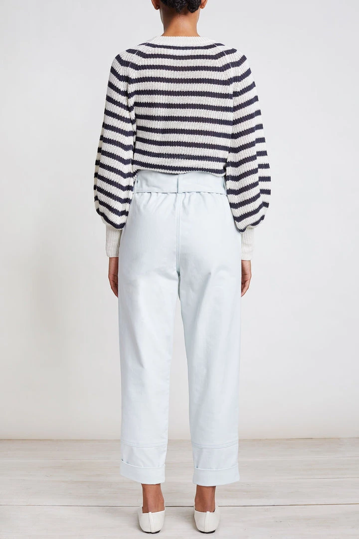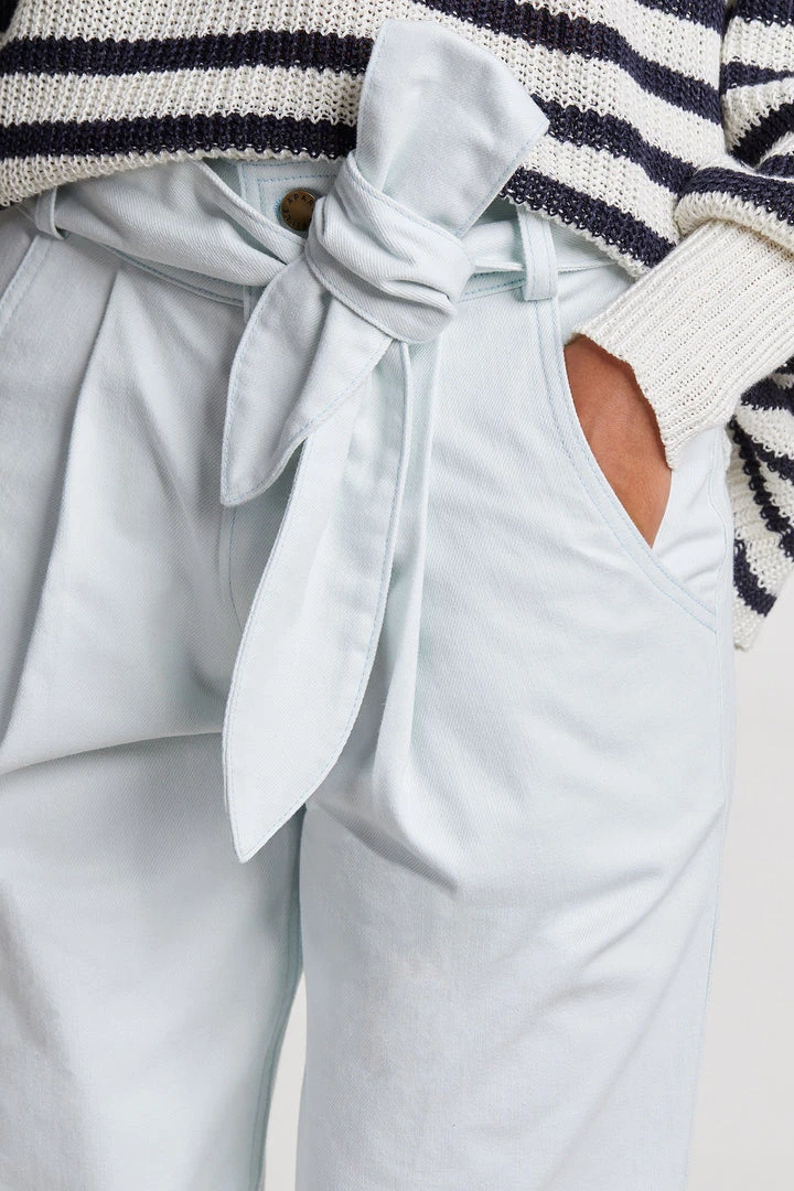 Sitting high on the waist, with a front pleat detail, double button and zip fly with removable self-tie belt. Elastic on the back waistband, a tapered leg and side pockets create a relaxed, yet refined fit.