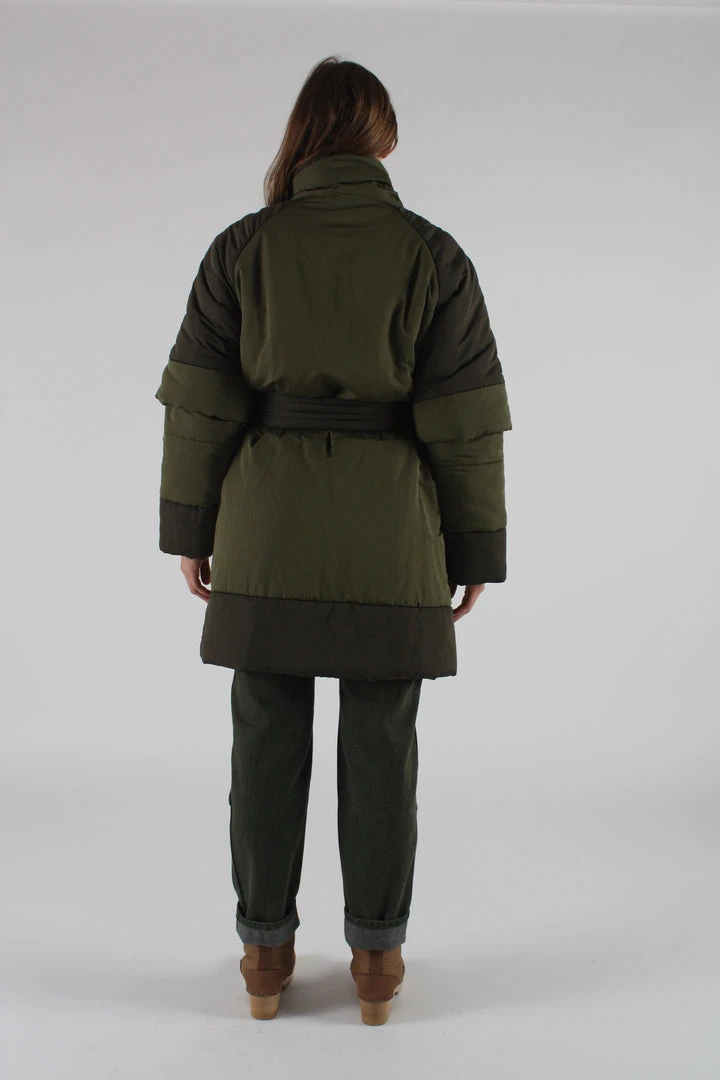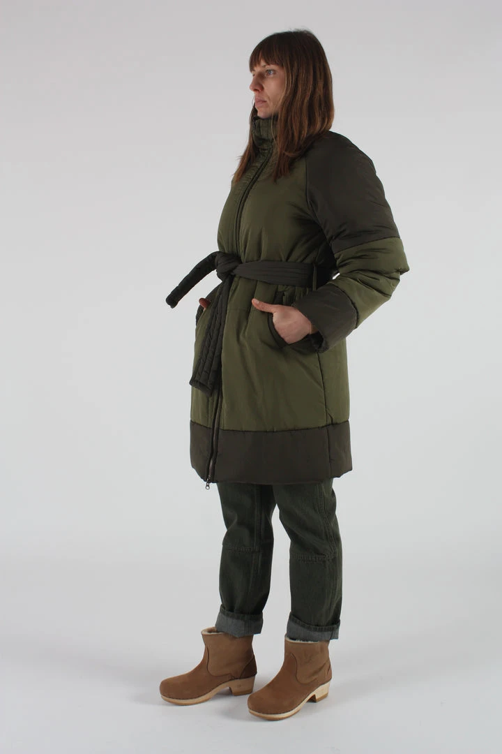 Longline silhouette, full zip front, deep pockets and an optional belt that adds definition. The quilted shell is padded to keep heat locked in, and the oversized collar perfectly deters the wind.