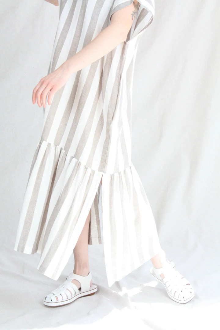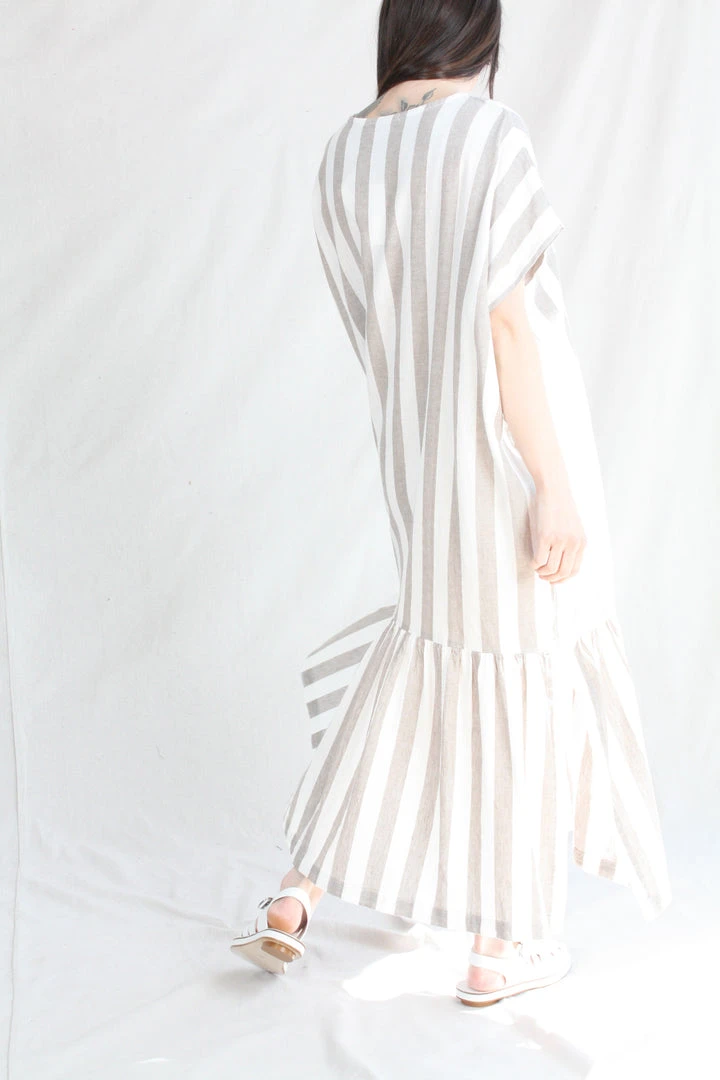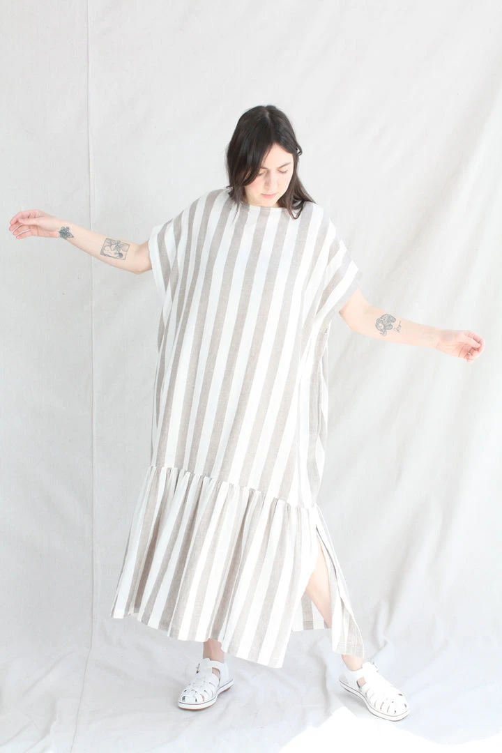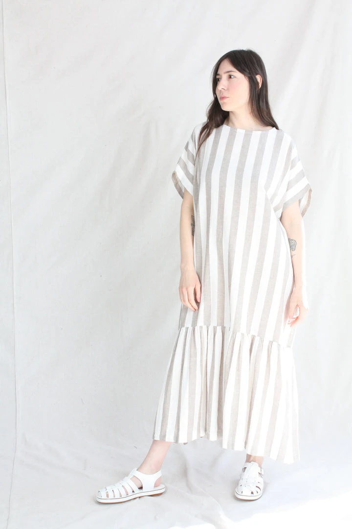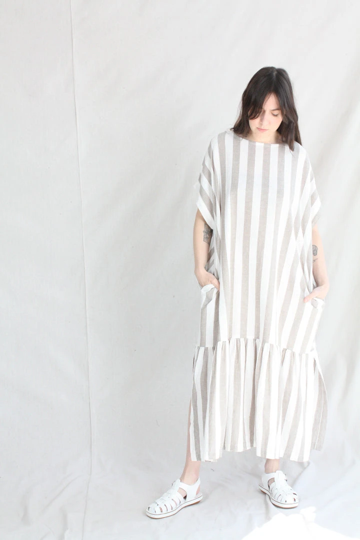 AÂ relaxed, airy dress in a super soft wide stripe cotton, linen. Crew neck. Ruffled bottom with side slits. Side slip pockets.Â