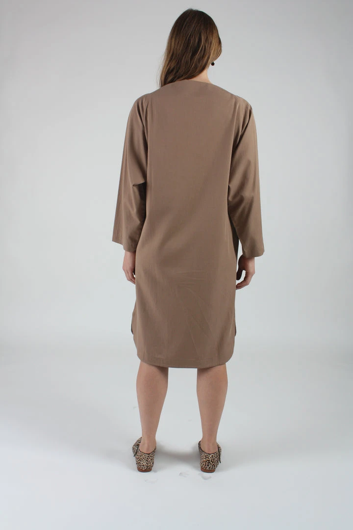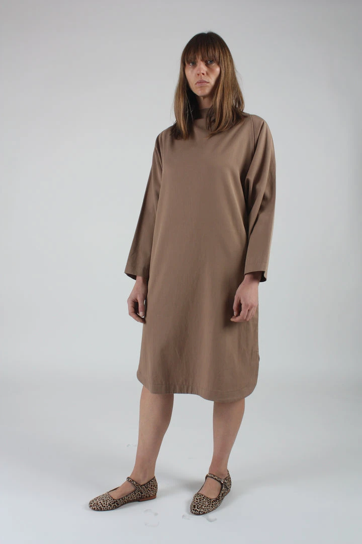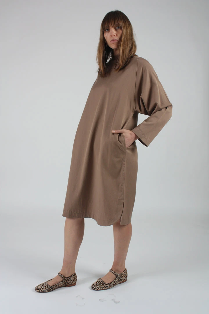 A relaxed, pullover dress with a folded neck. Dolman and raglan sleeve. Curved hem detail. Side seam pockets.
