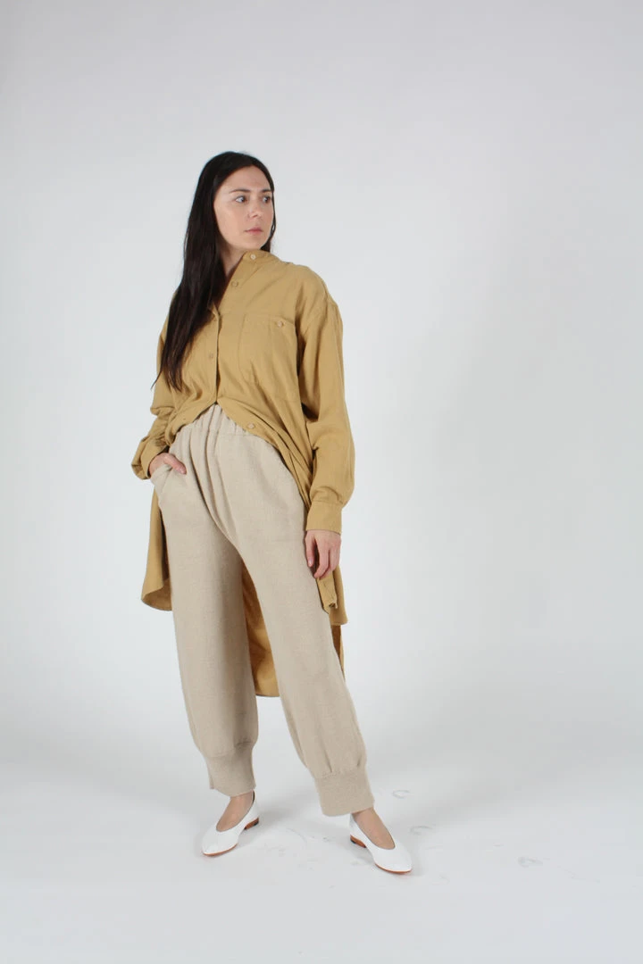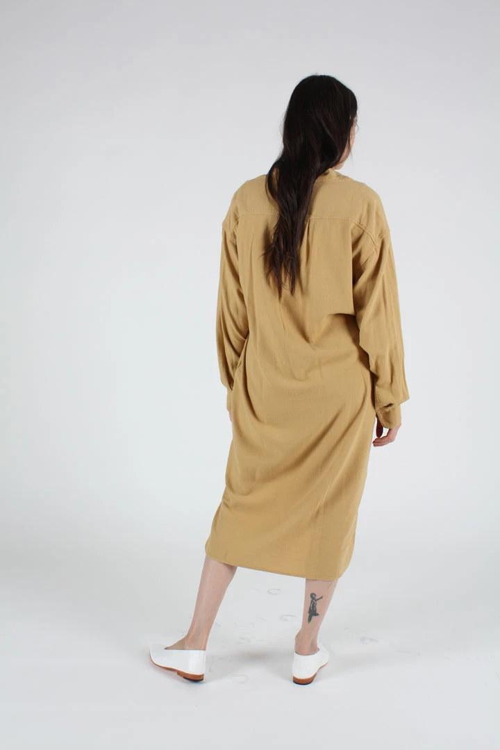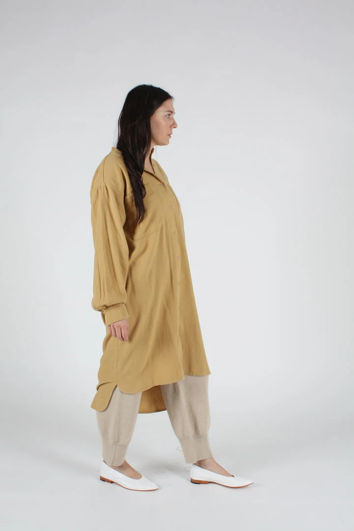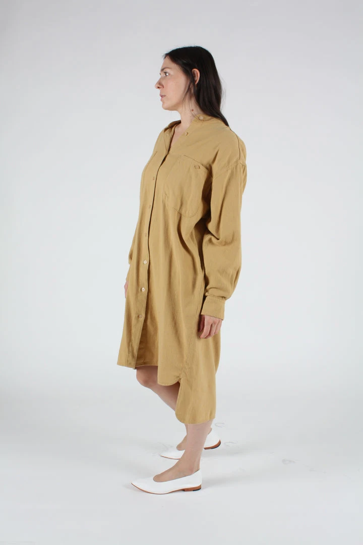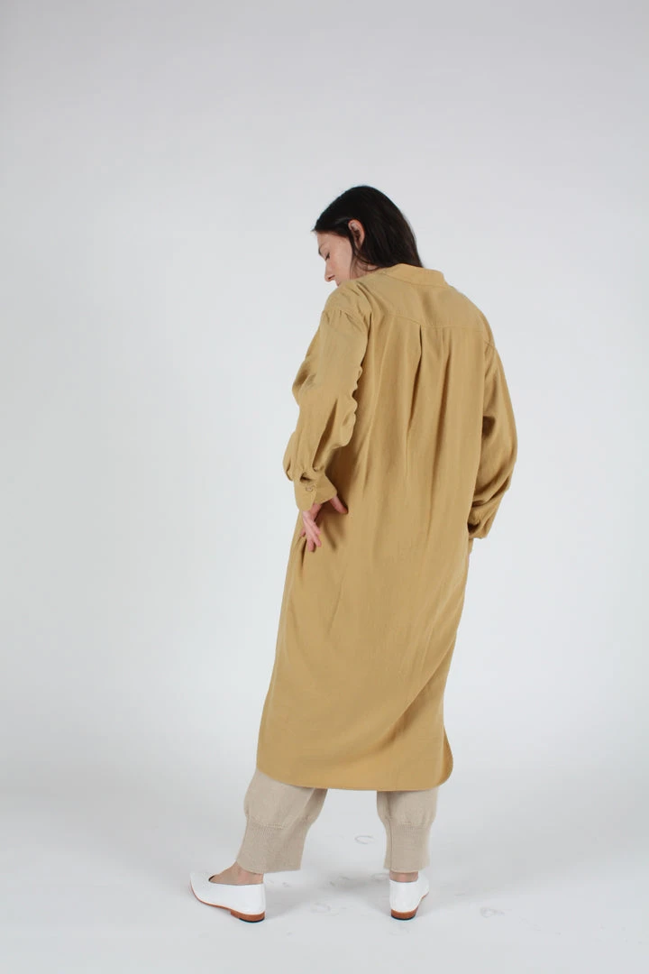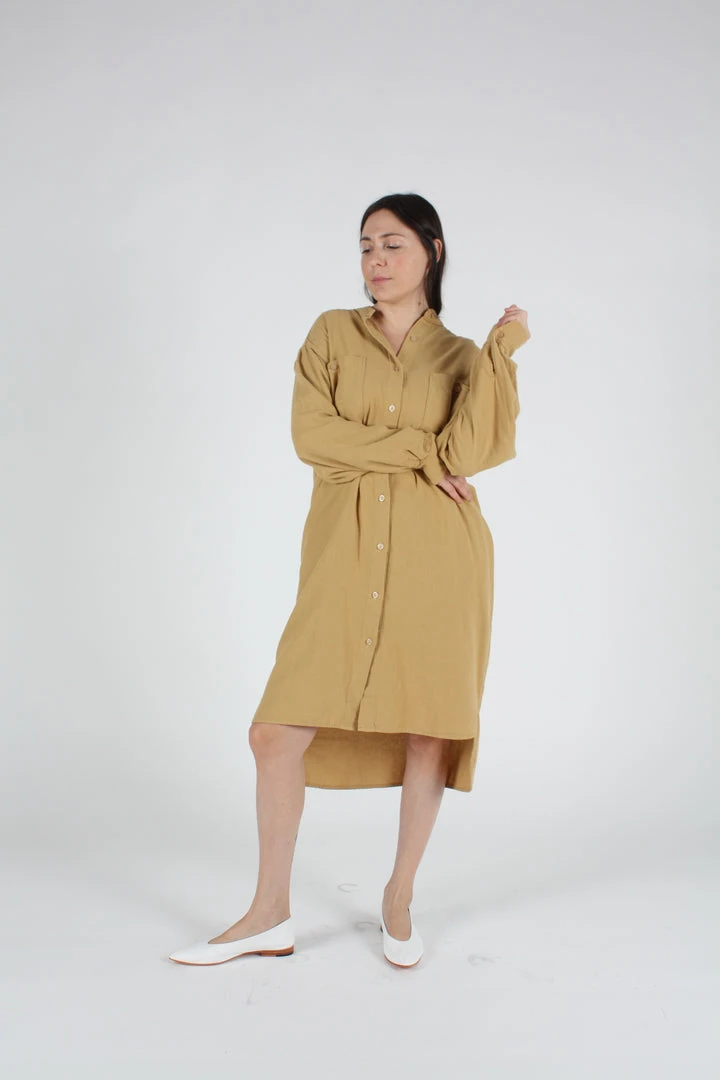A relaxed fit shirtdress in cozy golden cotton flannel. Stand collar. Front detail and side seam pockets. High low hem.Â