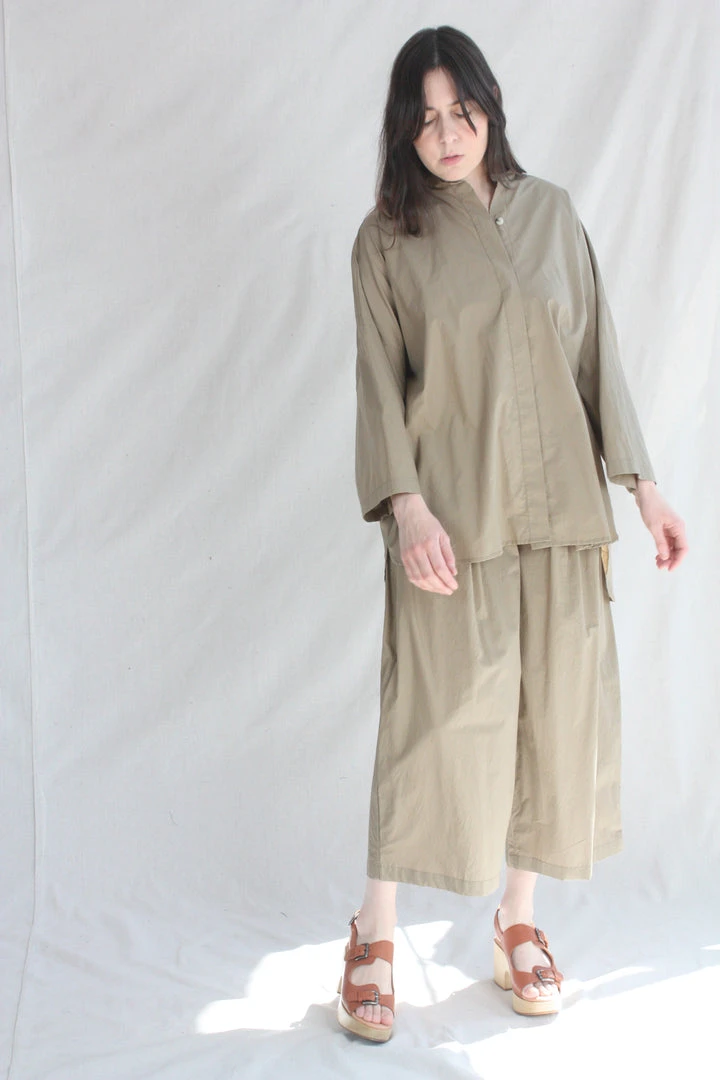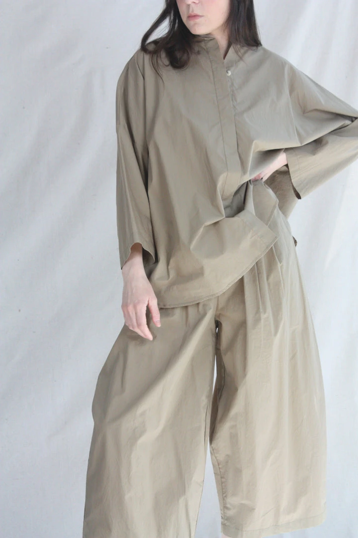 A relaxed shirt wit stand collar. Hidden front placket and dropped shoulder.Â