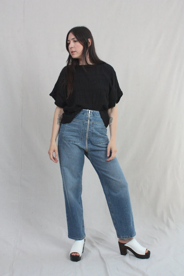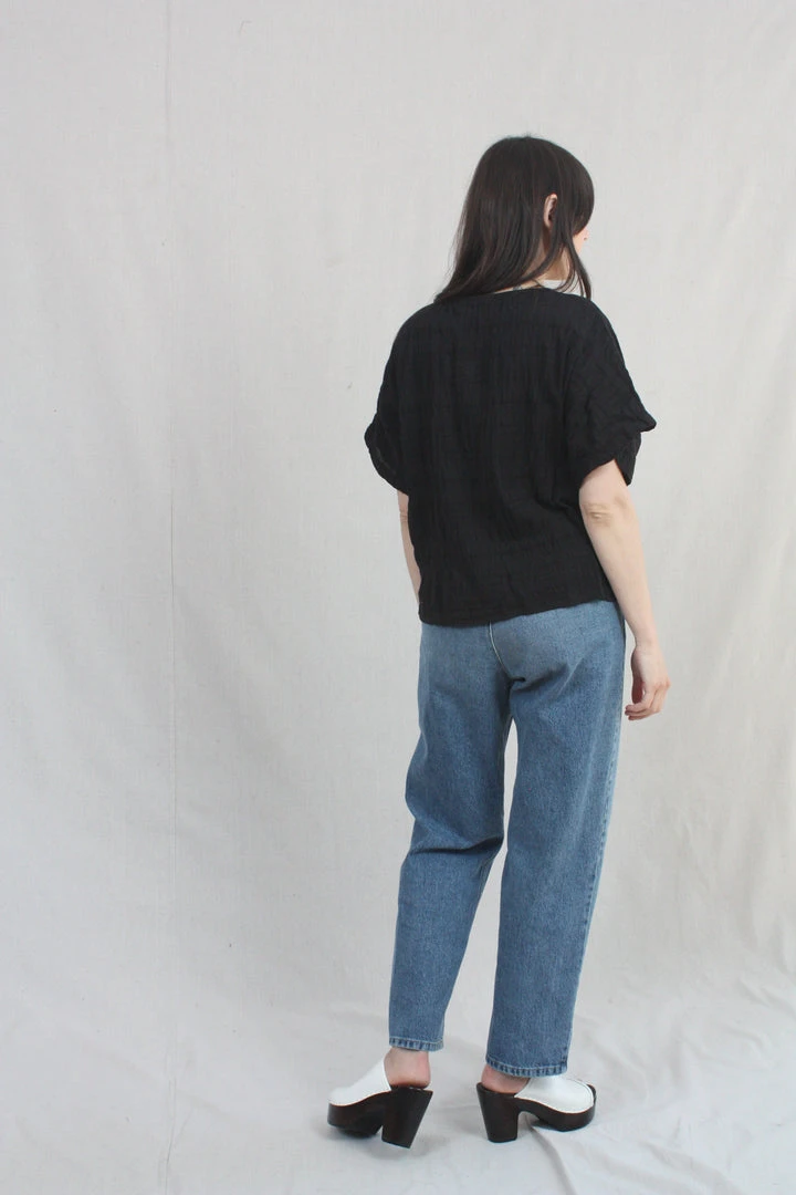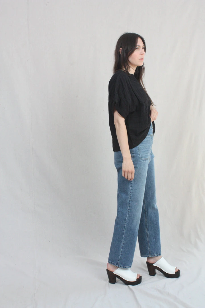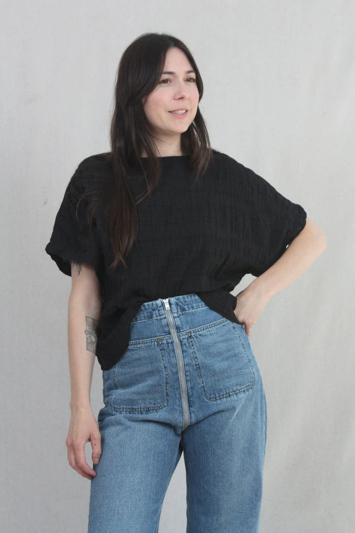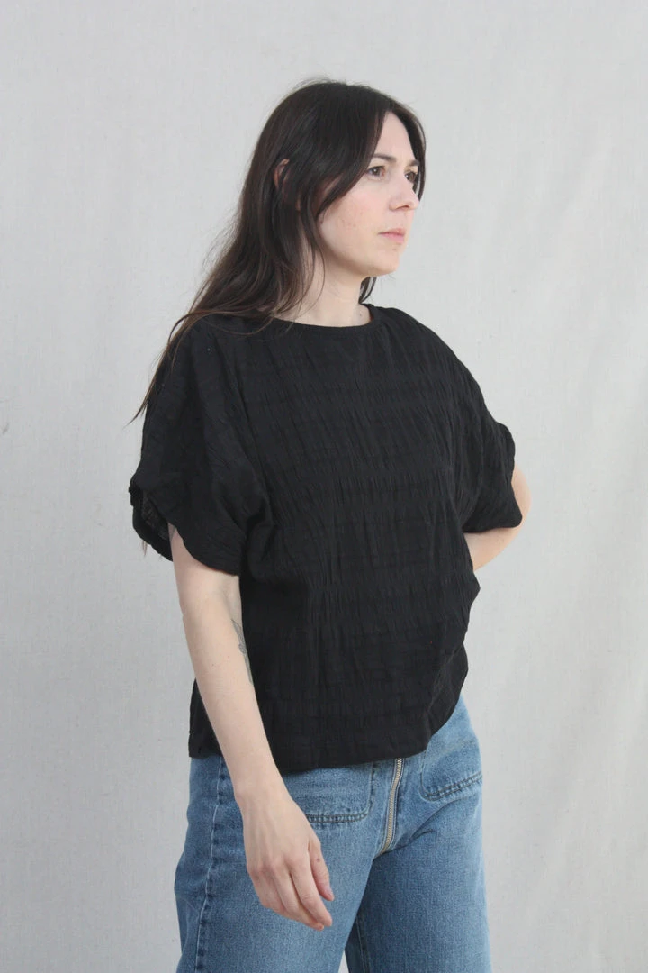 A relaxed top with a wide crew neck and boxy shape. Shirred fabric.