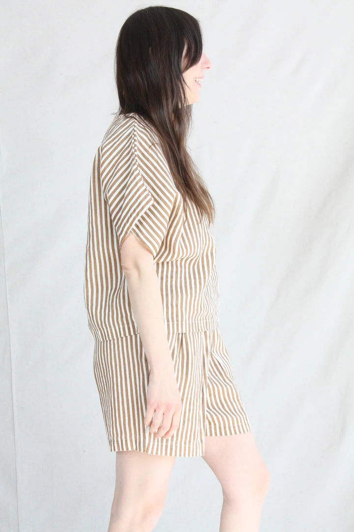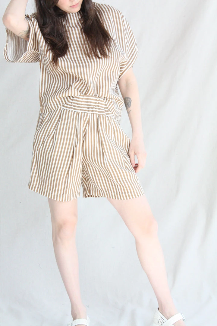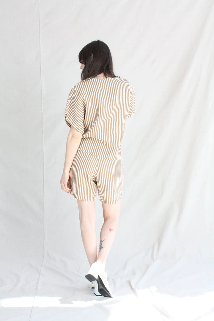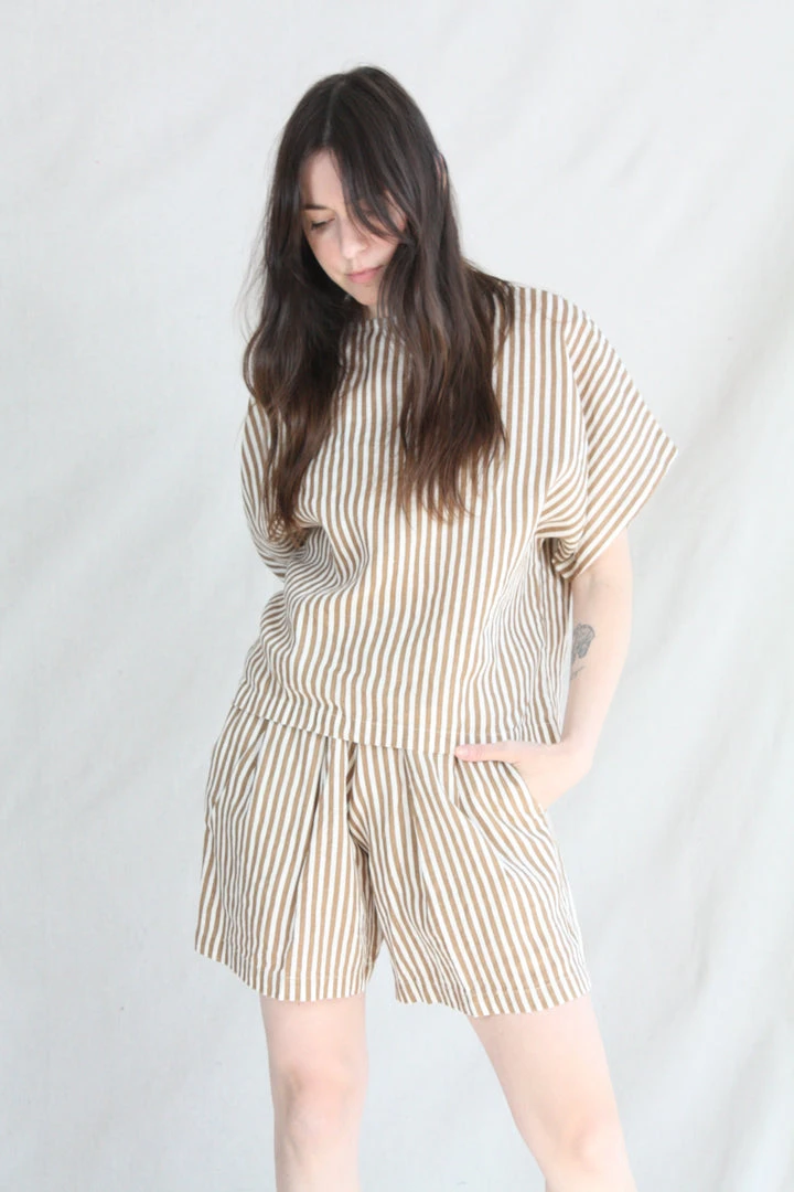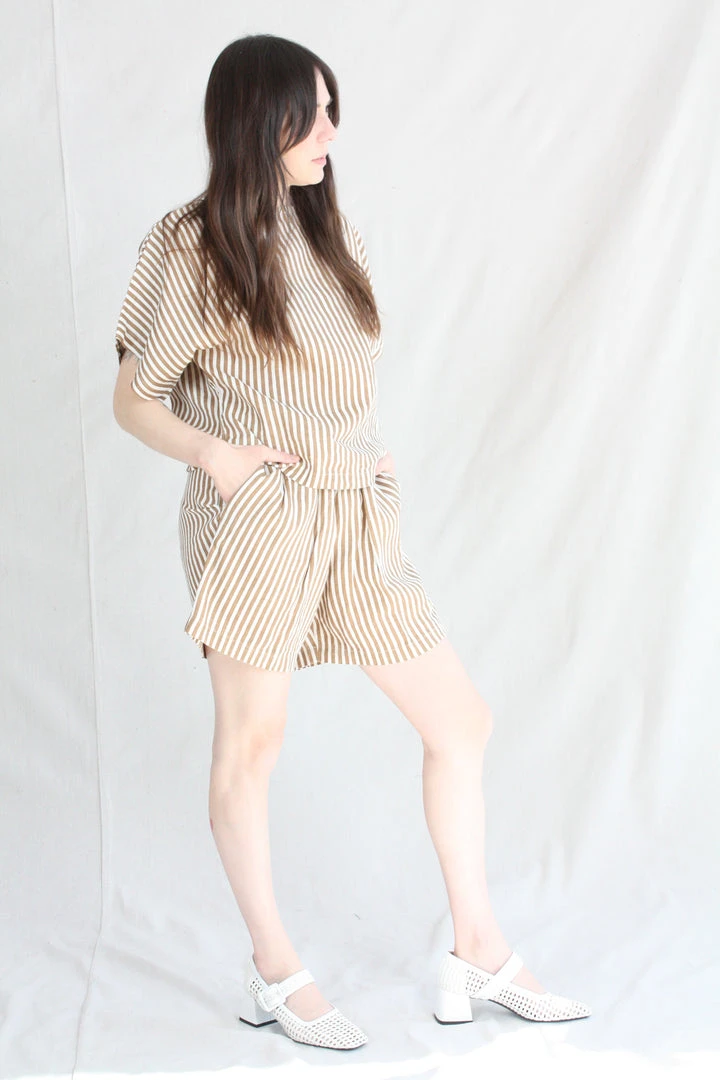 AÂ relaxed short with an elastic waistband. Front creased box pleats. Side seam pockets. The printed stripe is imperfect due to the texture of the linen.