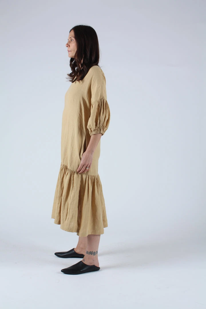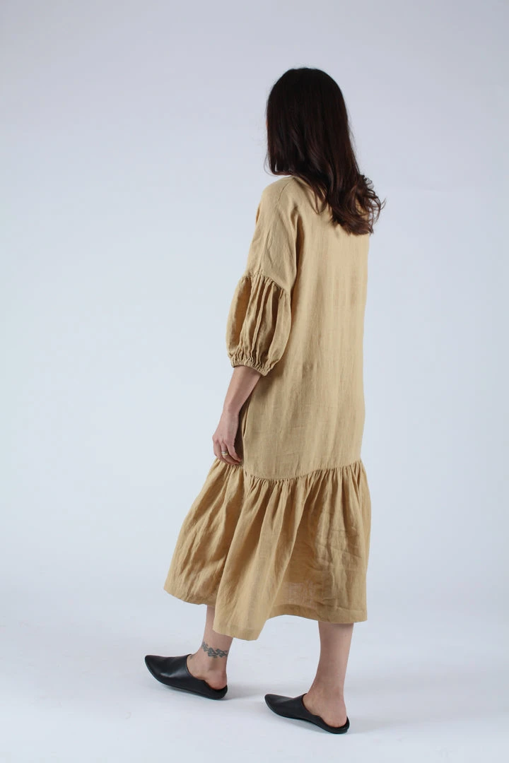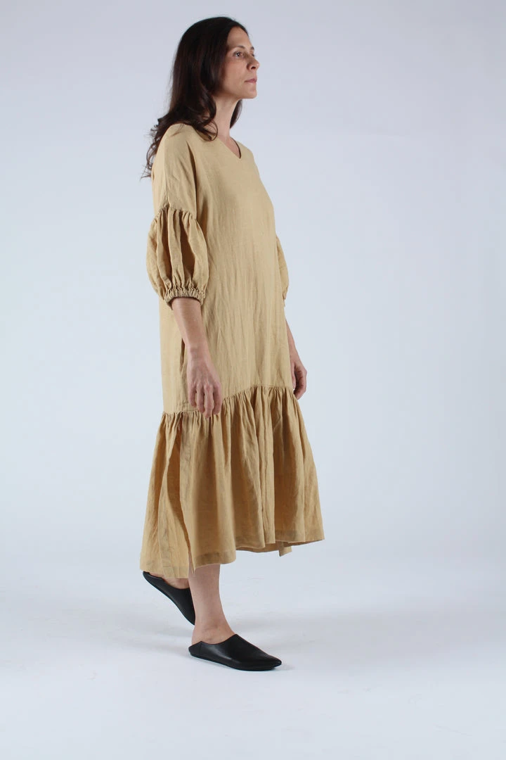 A relaxed airy dress with a v-neck and dropped shoulders. Shirred puff sleeves with elastic cuffs. Â Long side slits on bottom and side seam pockets.
