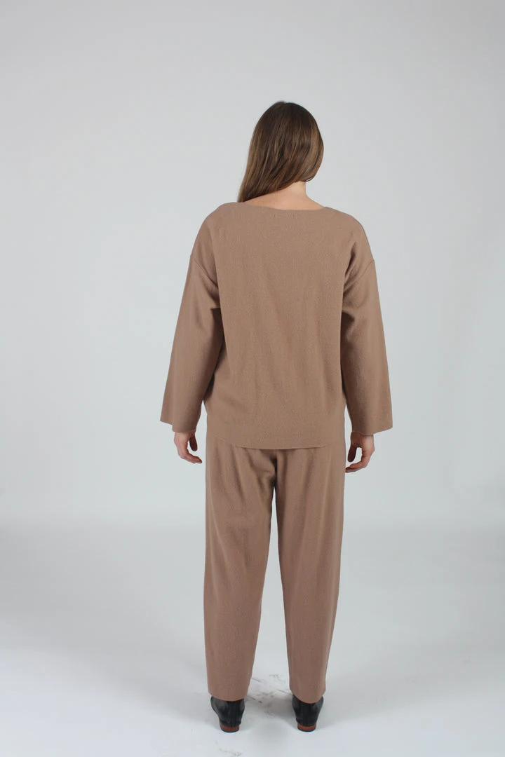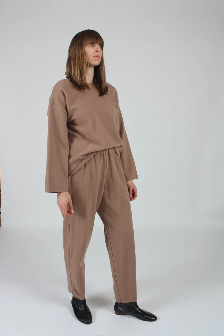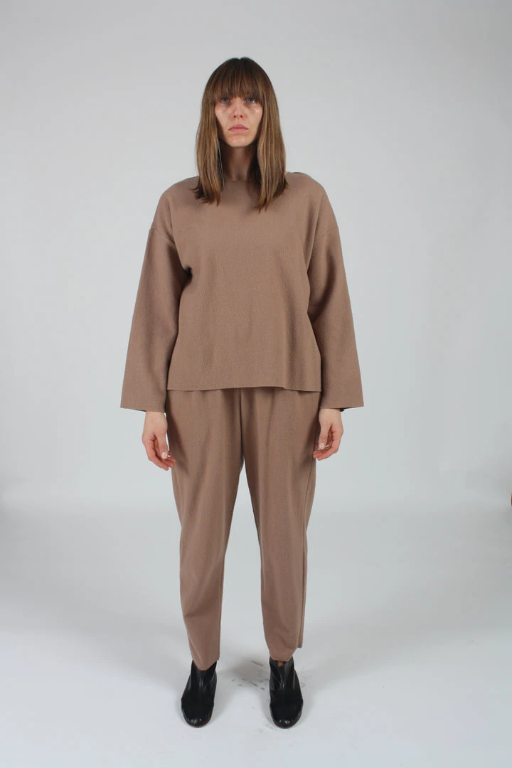 A relaxed wide crew neck top. Dropped shoulder with slightly boxy shape. Raw edge on neck, cuff, and hem with Japanese special fray prevention technologyÂ