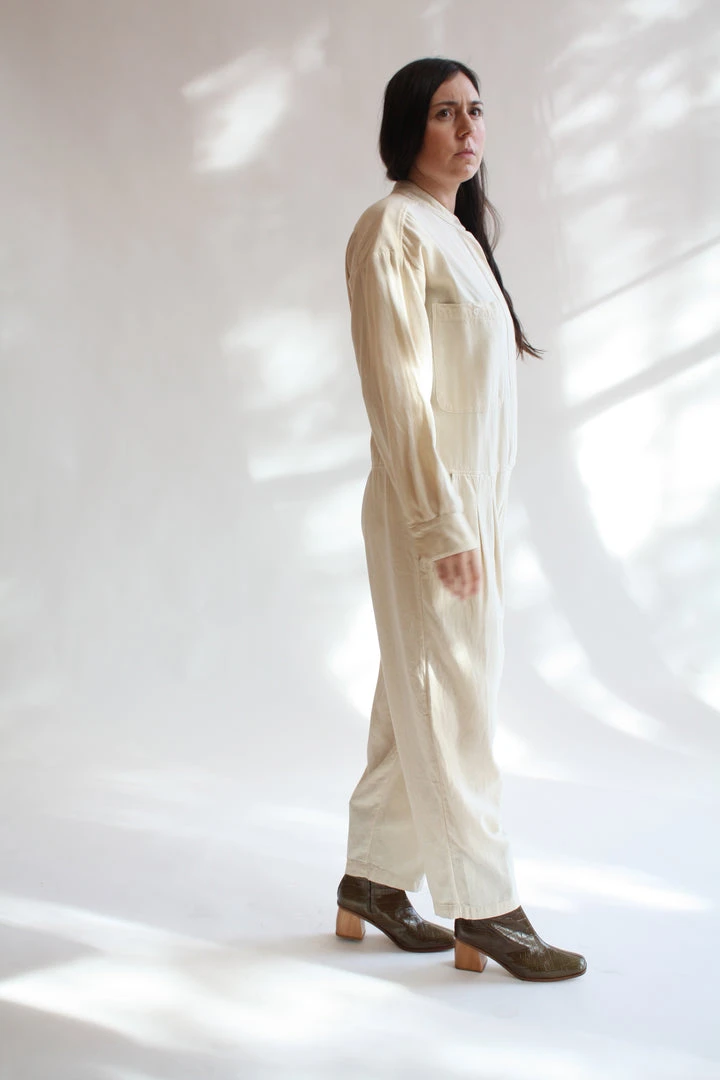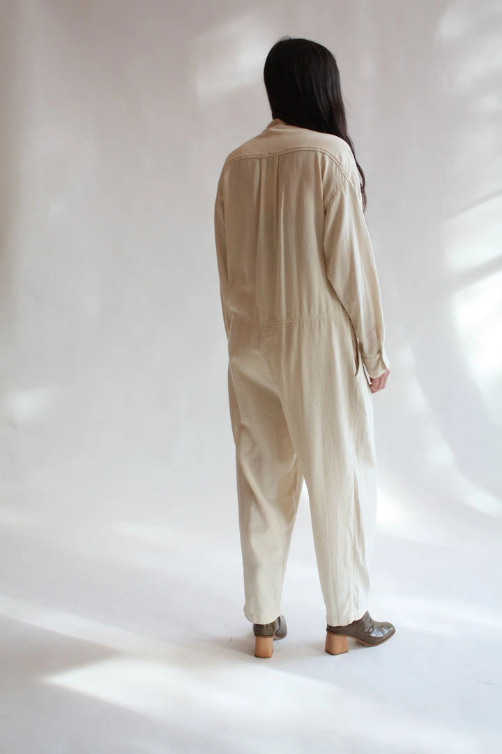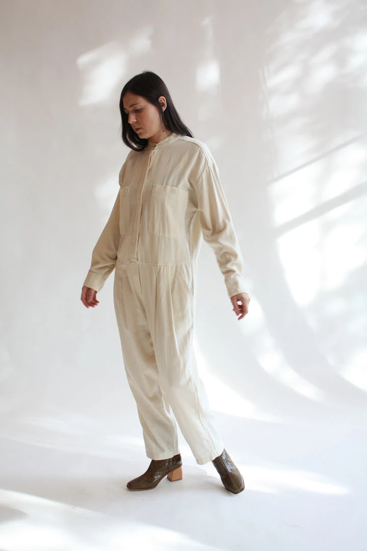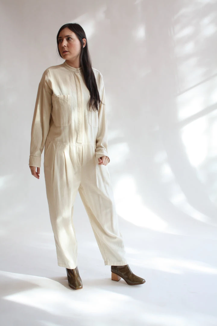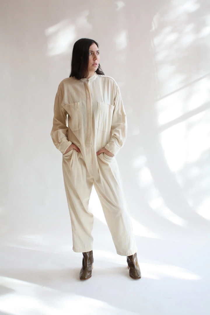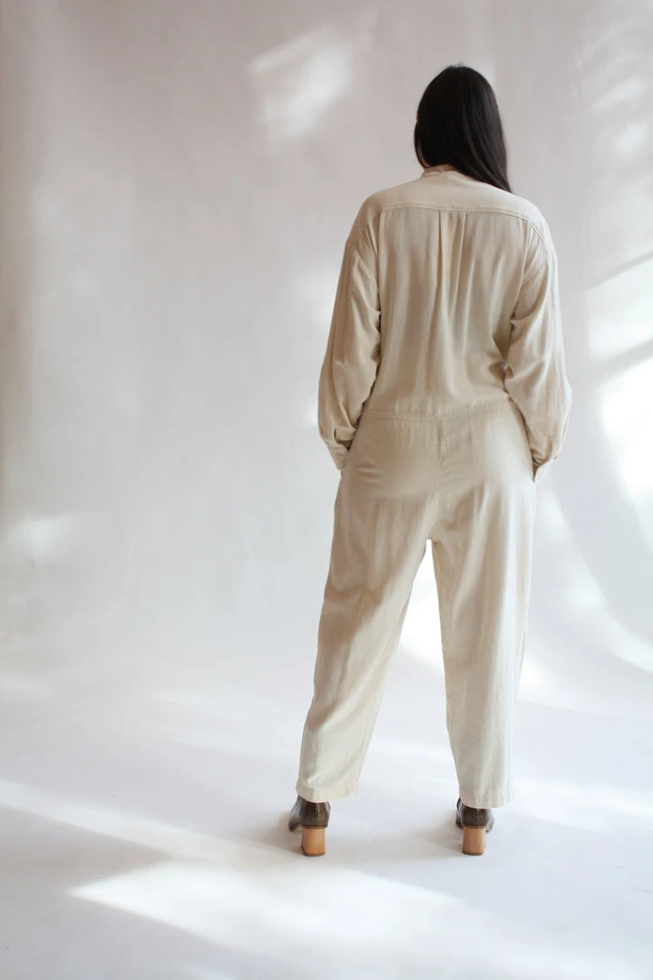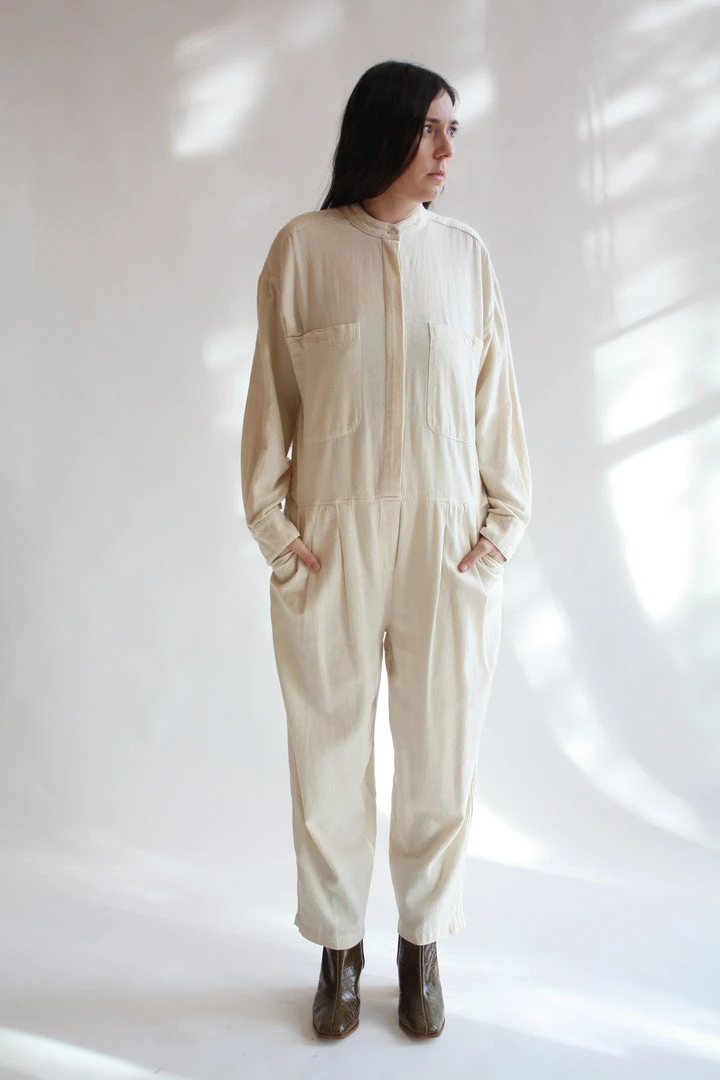 Relaxed fit jumpsuit in a cozy cream cotton flannel. Stand collar. Front detail pockets and side pockets. Pleated leg front and back. Tapered leg.