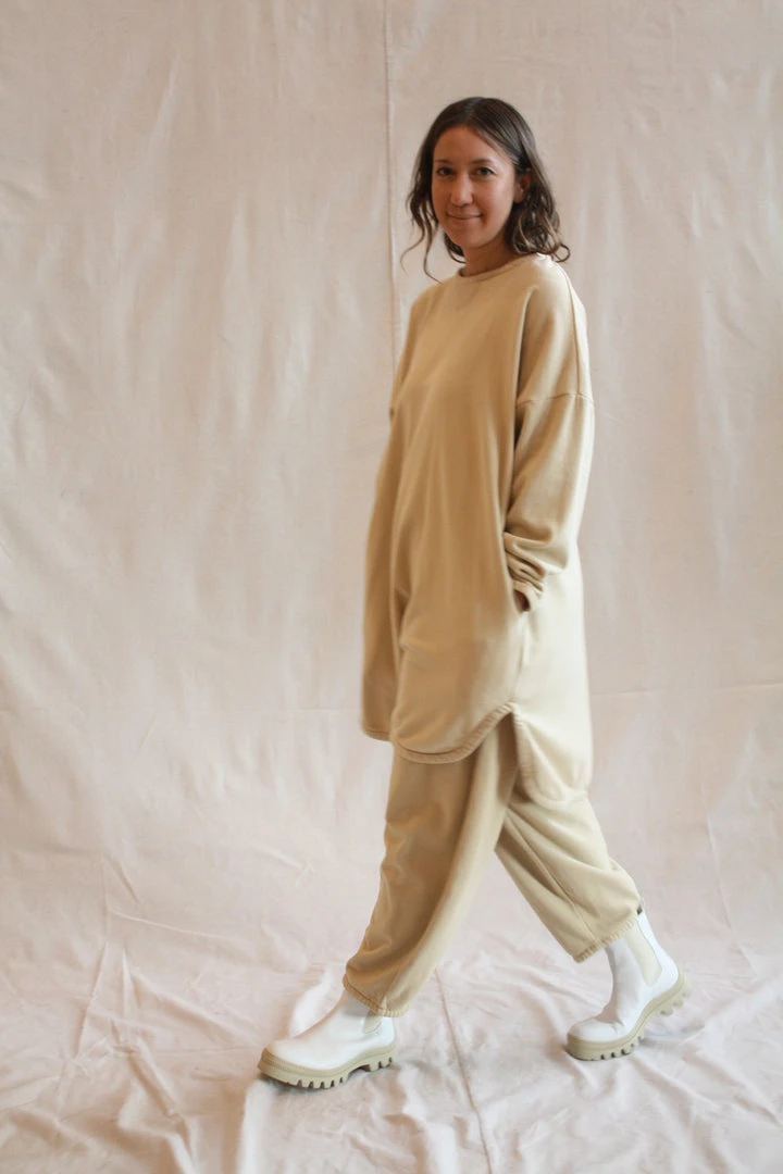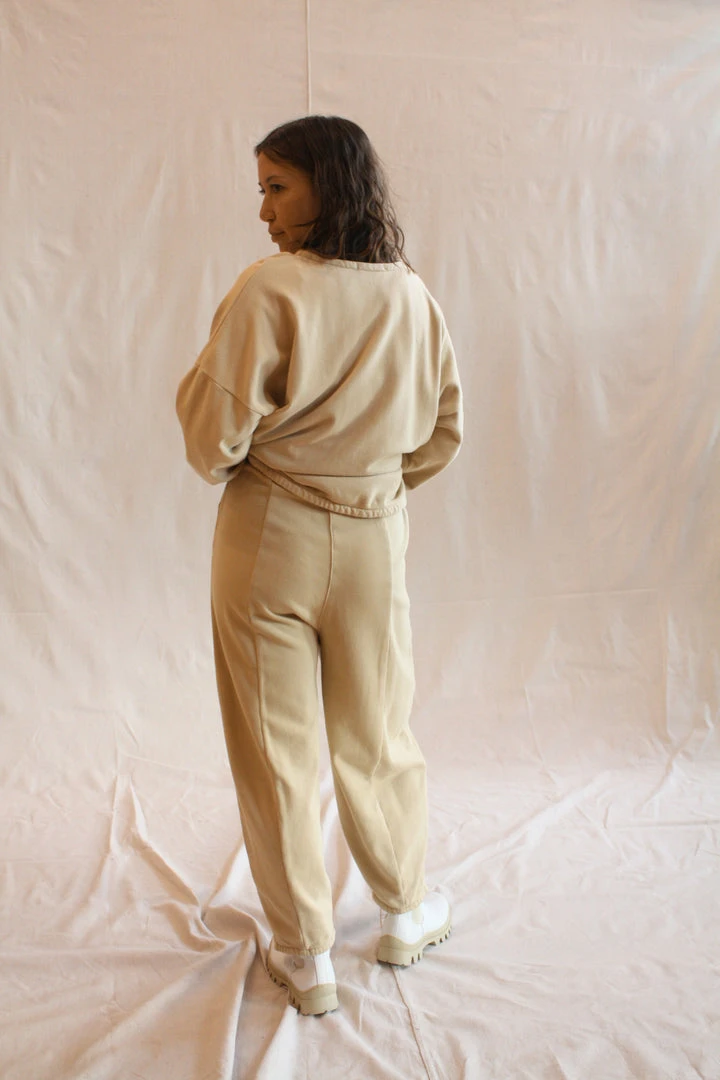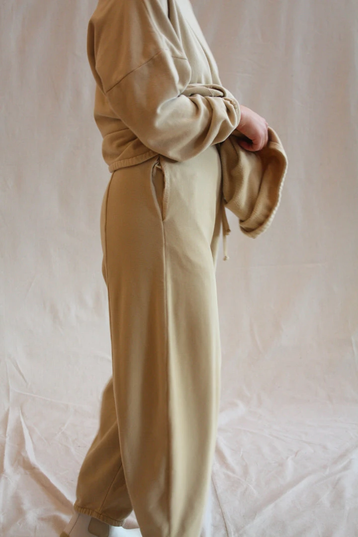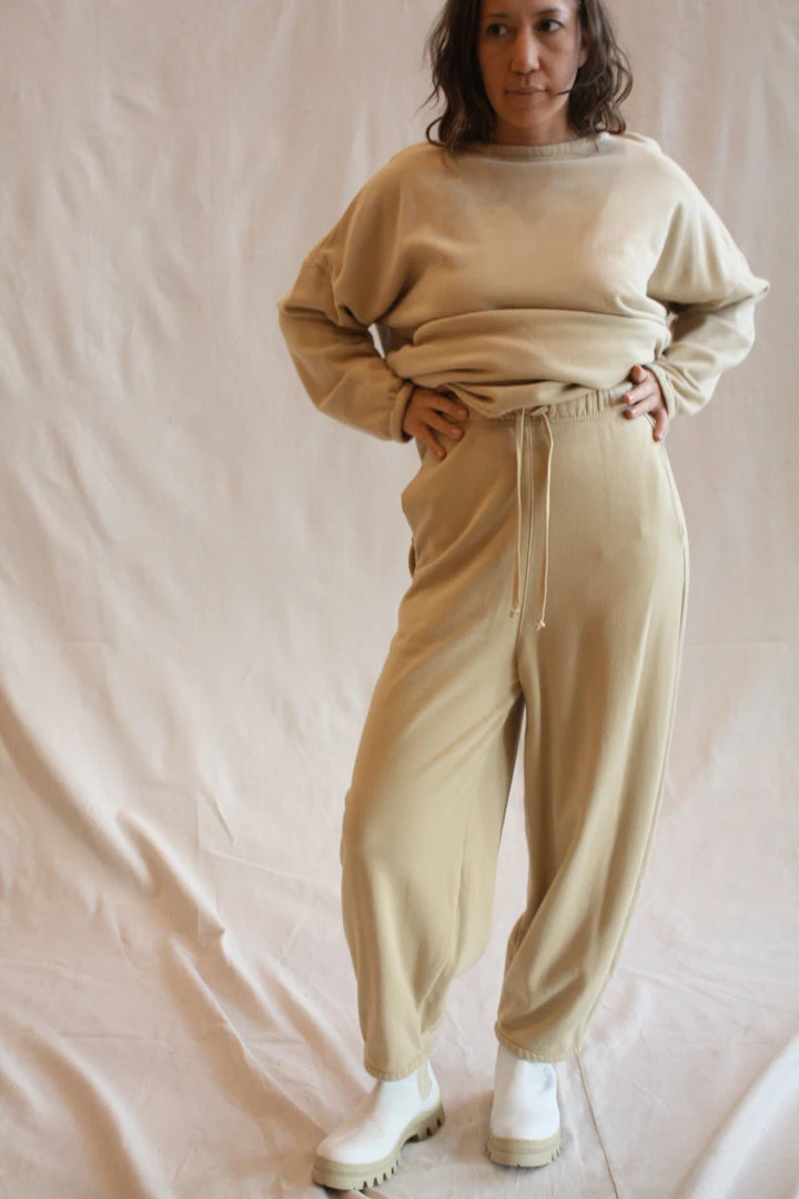 AÂ relaxed pant in cotton terry with a soft brushed inside for added comfort. Elasticized waist with adjustable drawstring. Wide leg with tapered bottom. Side slit pockets.