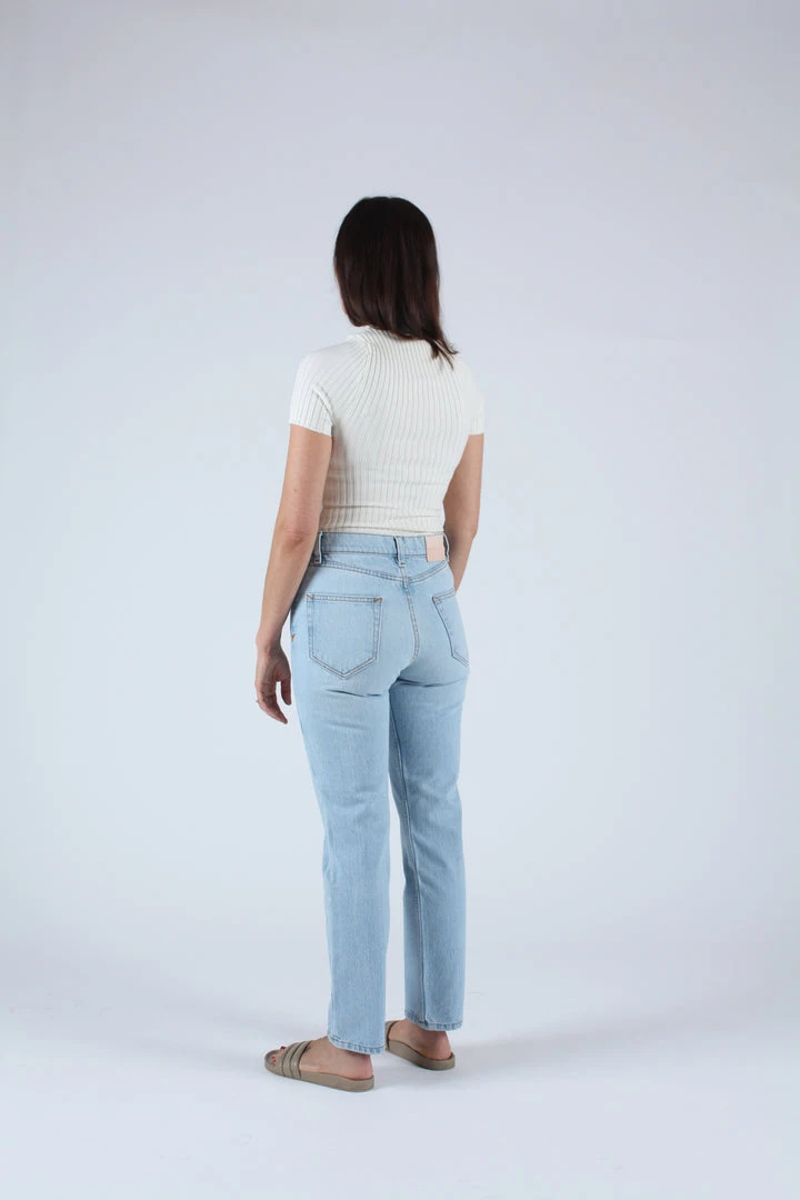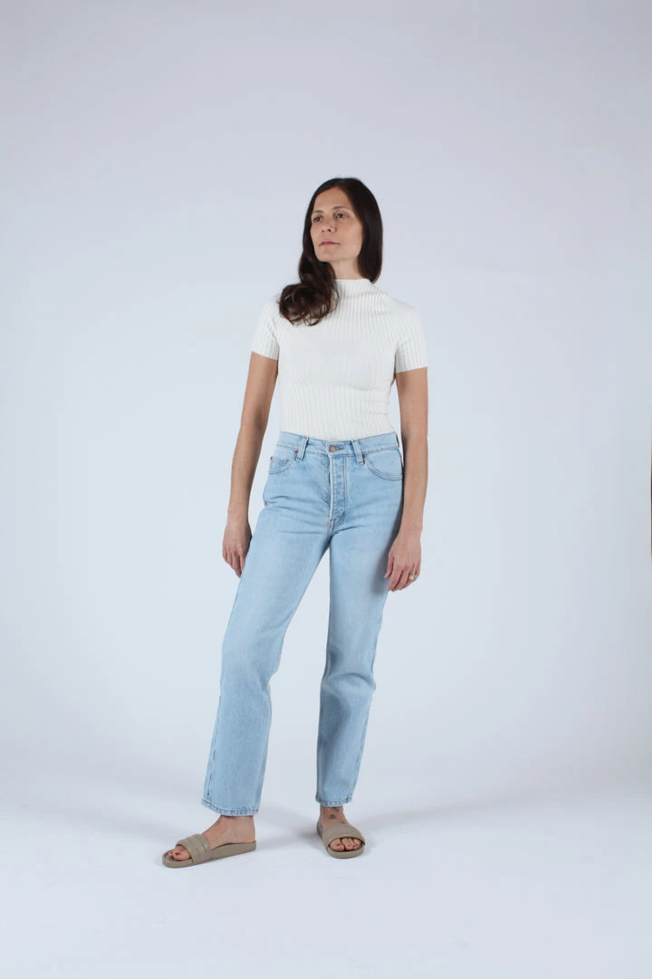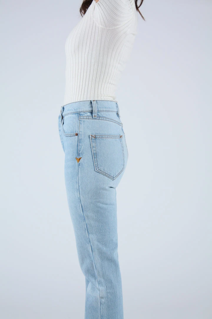 A timeless button fly silhouette with a rise that sits at high hip, eases into a straight leg, and hits at the ankle. Light wash deadstock cotton indigo denim. Each pair features custom BAM hardware, pocket bags made from deadstock stripe shirtings, and our signature embroidered Western arrow bar tack.