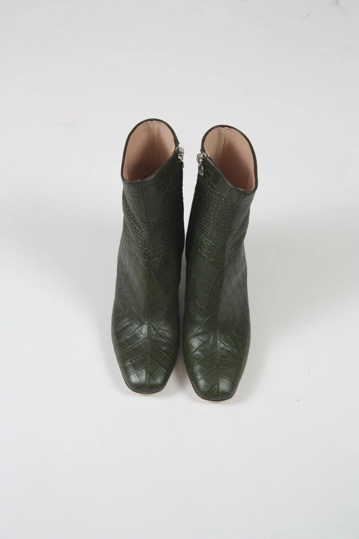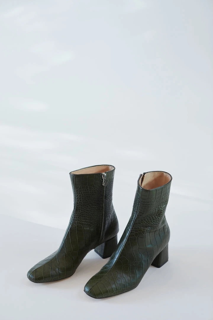 The Kaya Boot is Brother Vellies’ take on a traditional Chelsea boot, made more feminine by a slightly tapered toebox and higher heel. In stamped-croc leather with a calf skin lining.