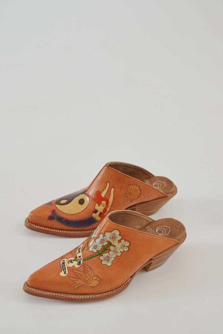 Cowboy style mules hand painted with symbols, made in very small batches.