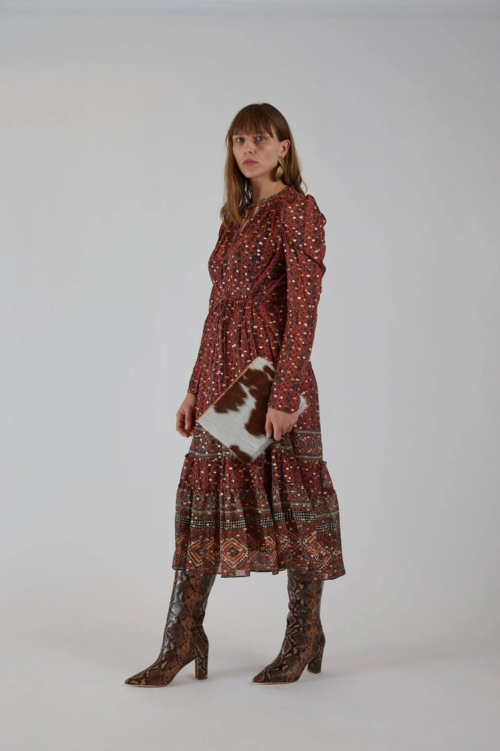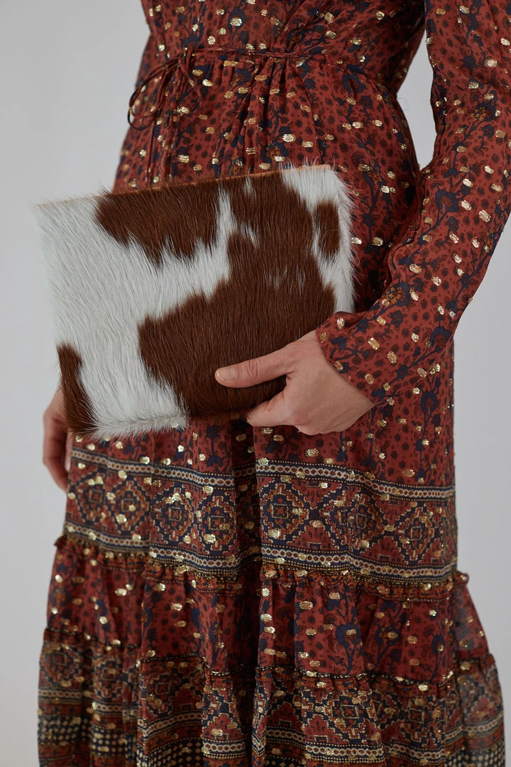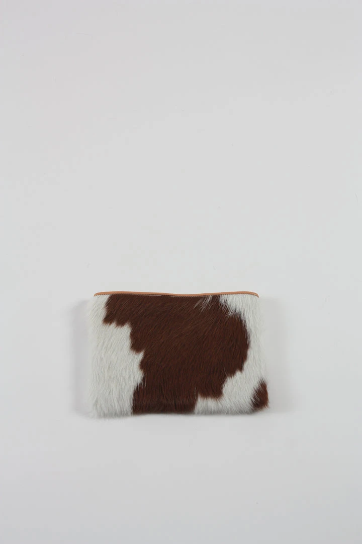 The Wallflower Pouch in brown and white cow hair features a magnetic closure and interior pockets. It is lined with supple Ethiopian vegetable dyed leather, which absorbs elements from its surrounding environment, making its appearance turn into a rich honey color over time. Each much is unique.