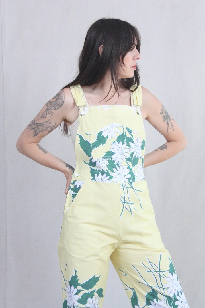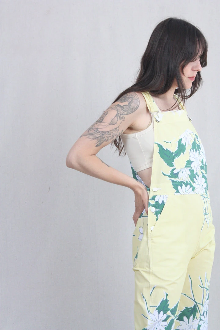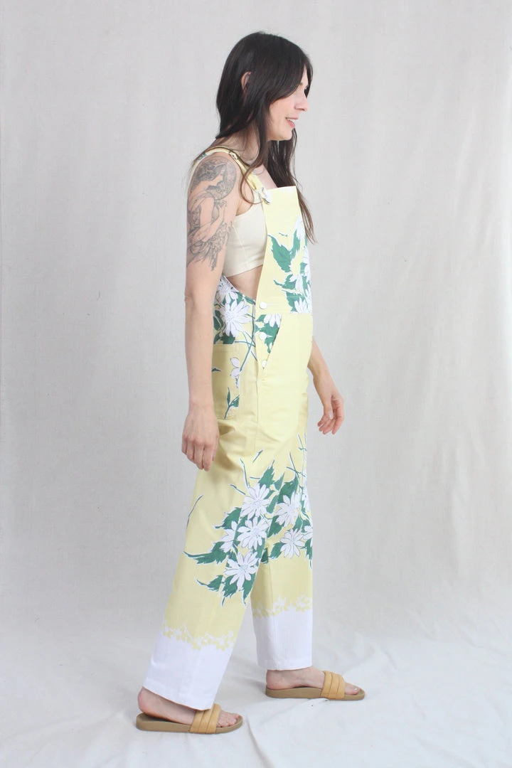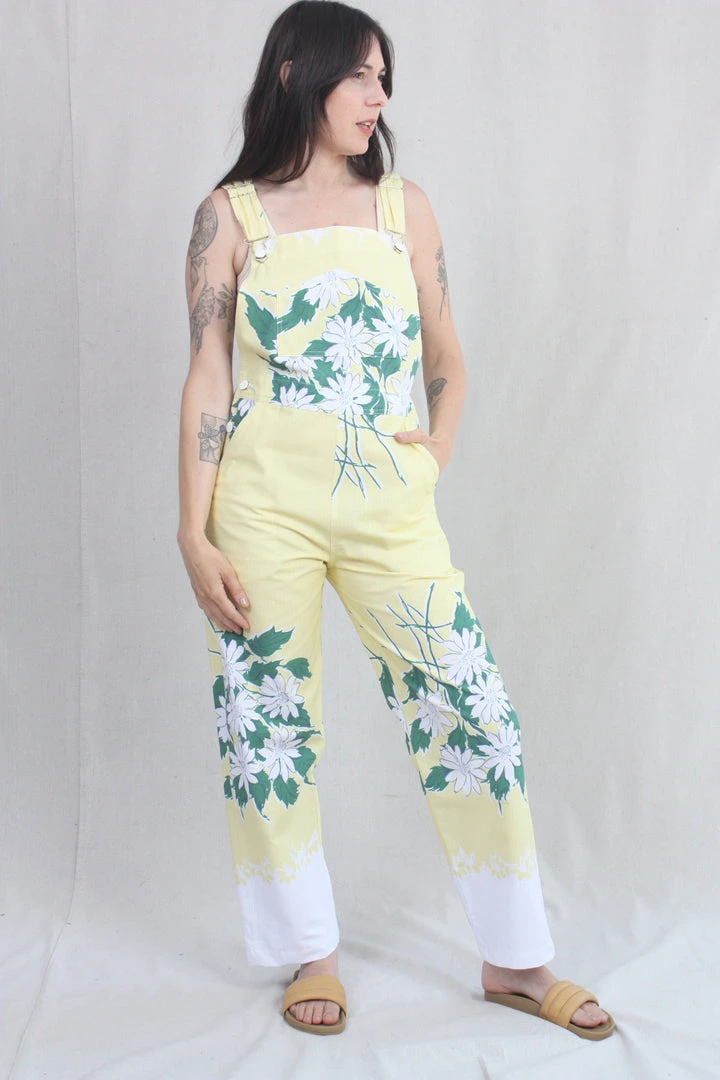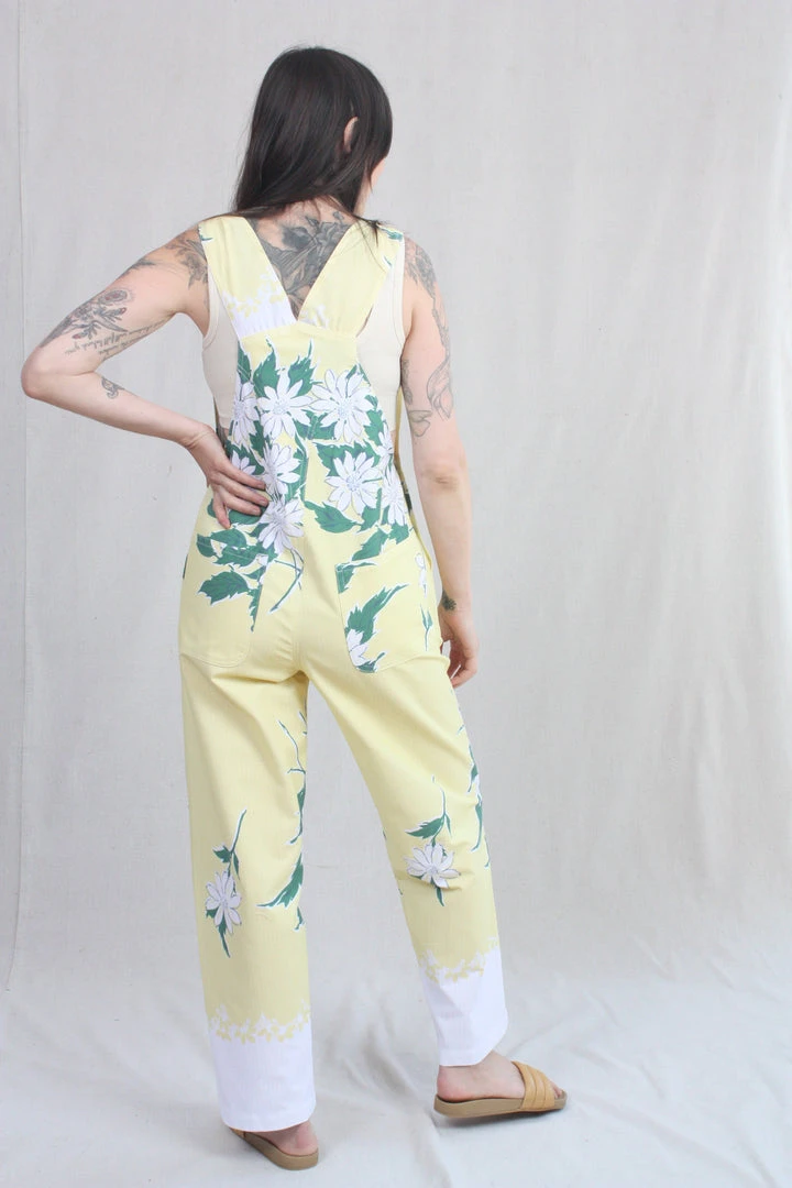 A classic slim, unisex overall shape rendered in a vibrant custom daisy border print, inspired by the vintage tablecloths. Cotton ripstop is sturdy and medium weight. Fit is true to size.