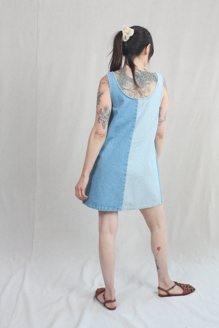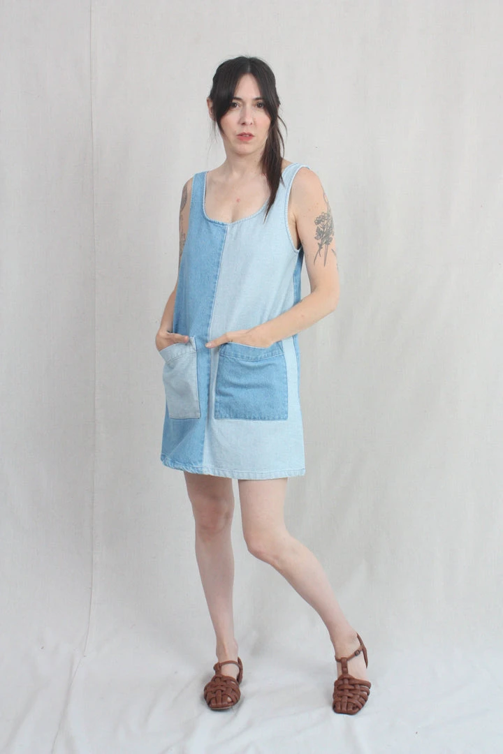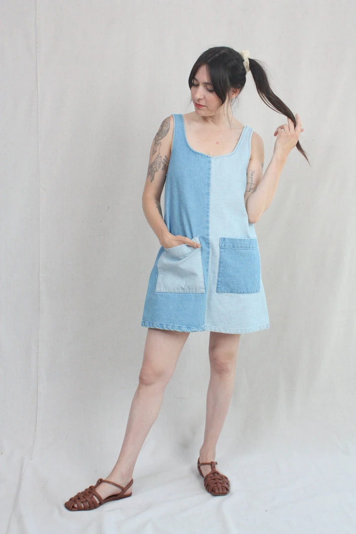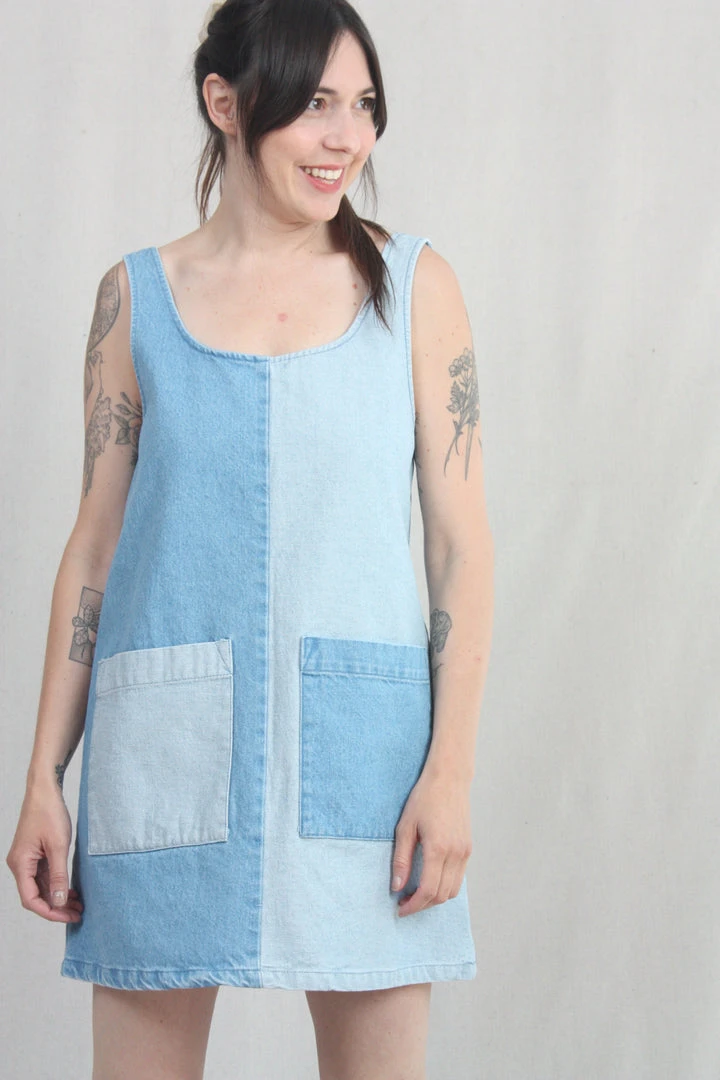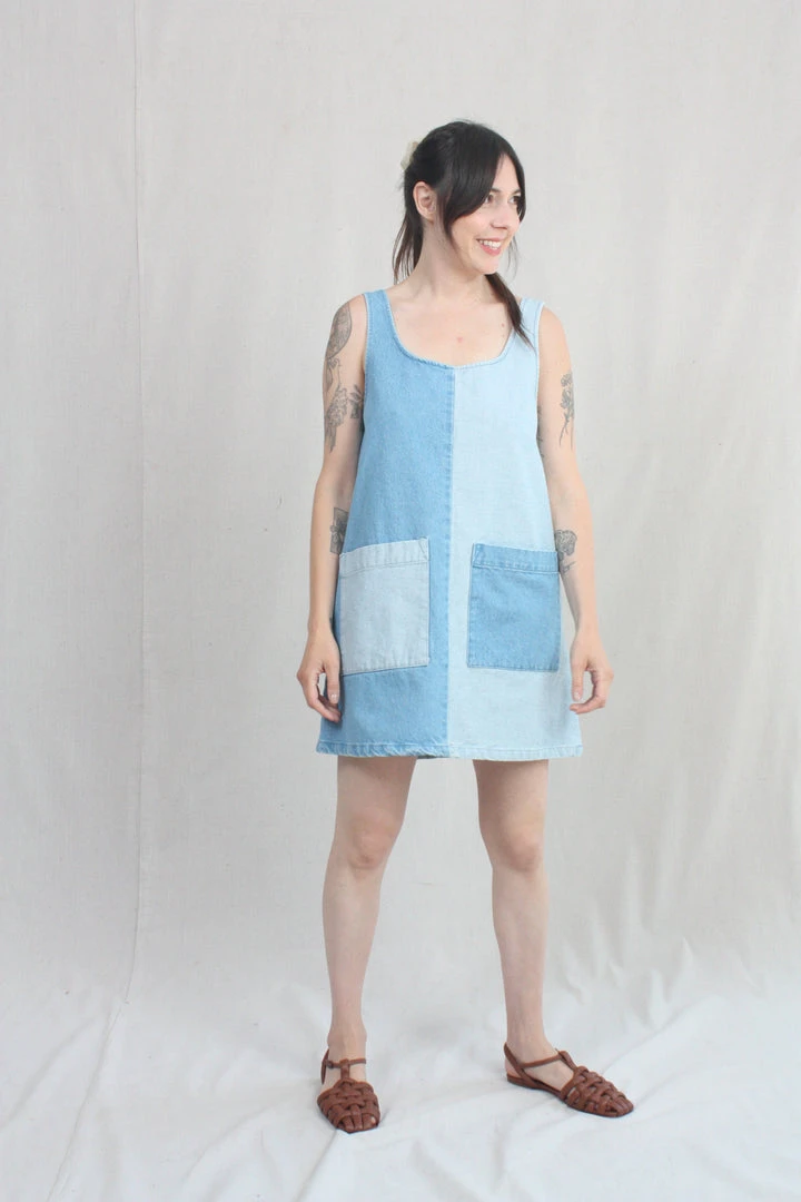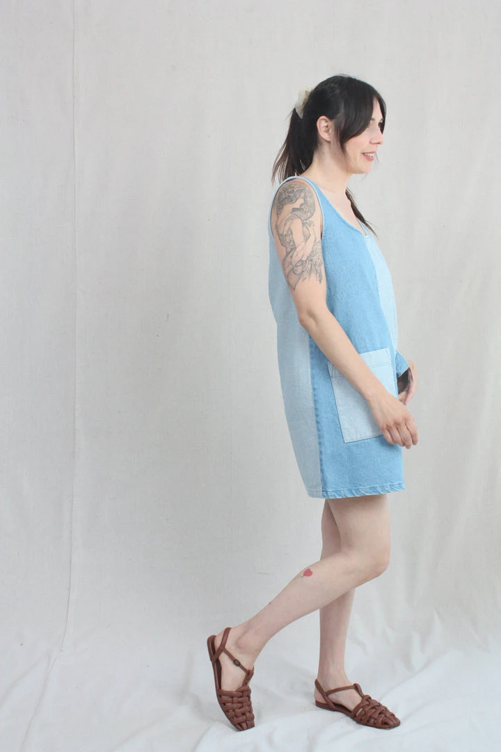 A denim dress for hot summer days. Loose, u-neck pullover style with large front patch pockets. Both the face and the reverse of the 100% cotton denim are used to create a color blocking effect from panel to panel. Easy care, easy wear, you will love this dress forever. It has been given a quick wash to soften it up a bit before it gets to you, and it will only get better with time.
