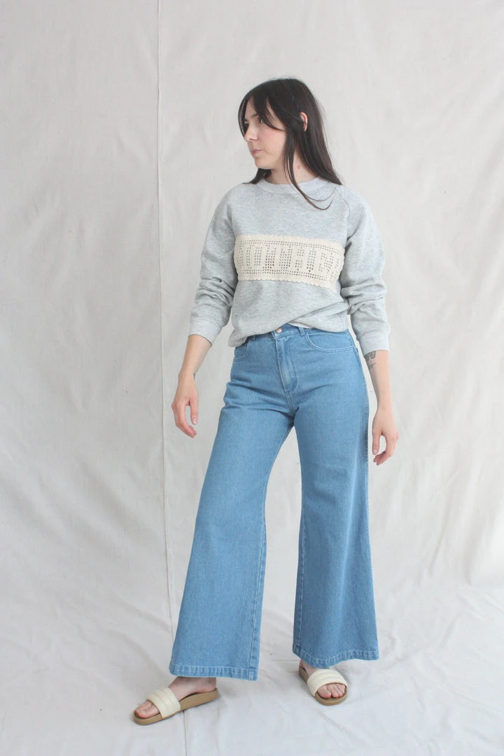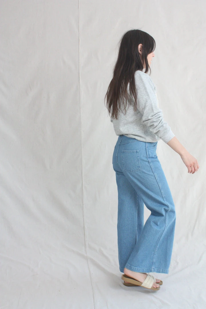 The Nelly has a high-rise fit through the torso, with a wide-leg silhouette from the thigh down. 100% cotton denim holds you in, but eases up in all the right places with repeated wear. Rinsed dark blue on the right leg and a light blue from the reverse side of the denim on the left. 12” rise. Each pair is given a quick wash to shake out some of the initial stiffness of raw denim.