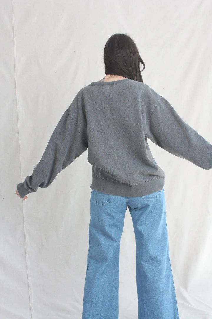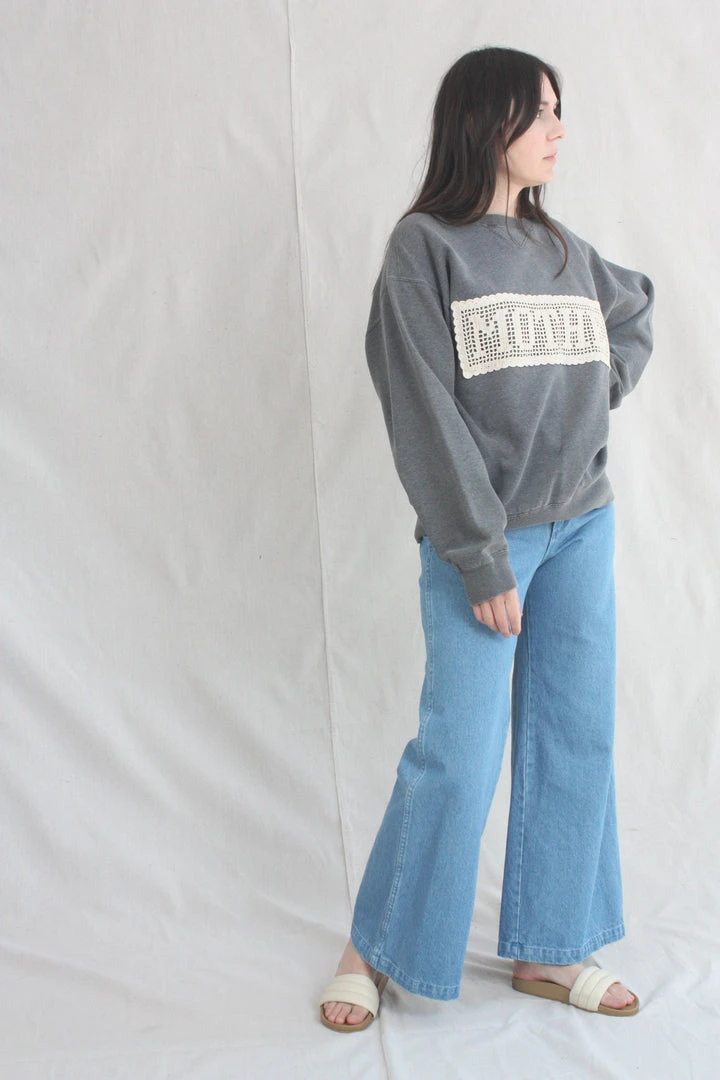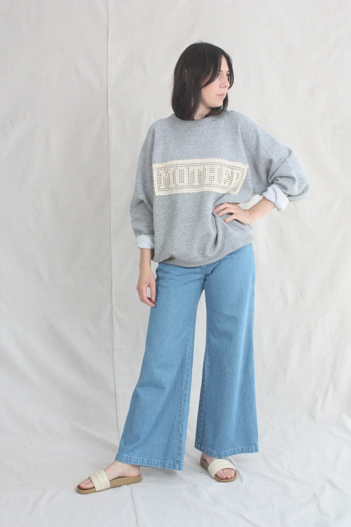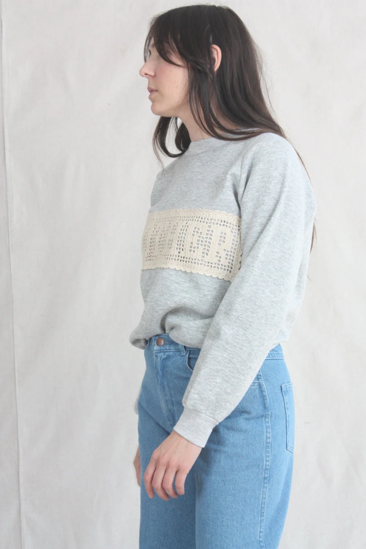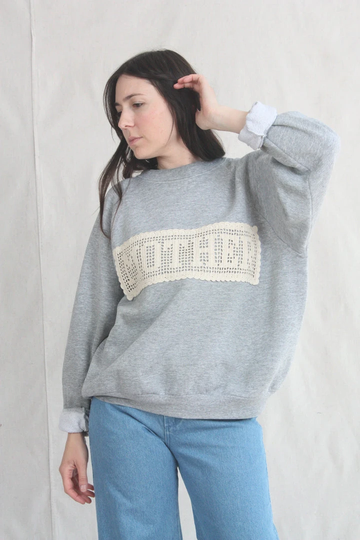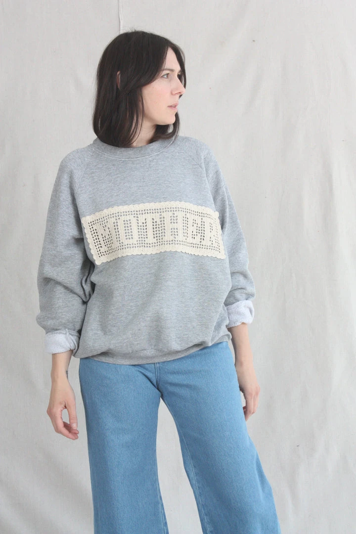 Are you a mother? Do you love a mother? Would they like this sweatshirt? Carleen commissioned panels that spell out MOTHER (crocheted by Nancy in Kentucky), and applied them to locally sourced vintage sweatshirts in various shades of grey. This sweatshirt features one of a kind textiles that we hand picked. They may include wear, distress, marks, and other signs of age intentionally as we believe this adds to the character of the finished garment.