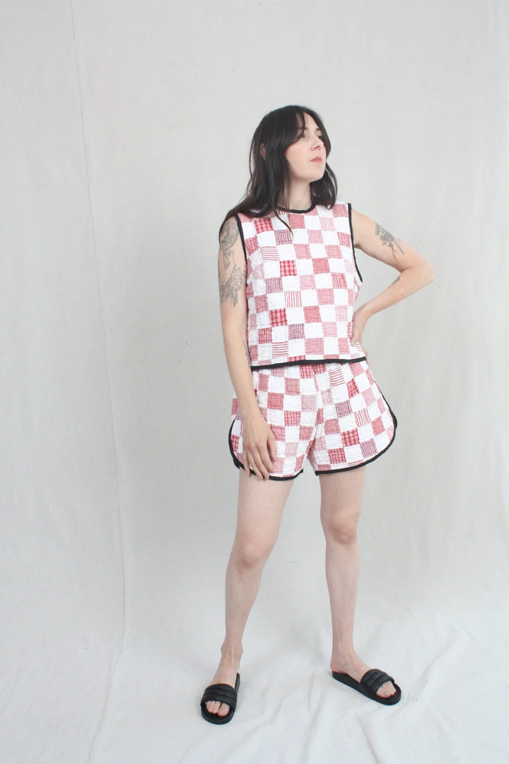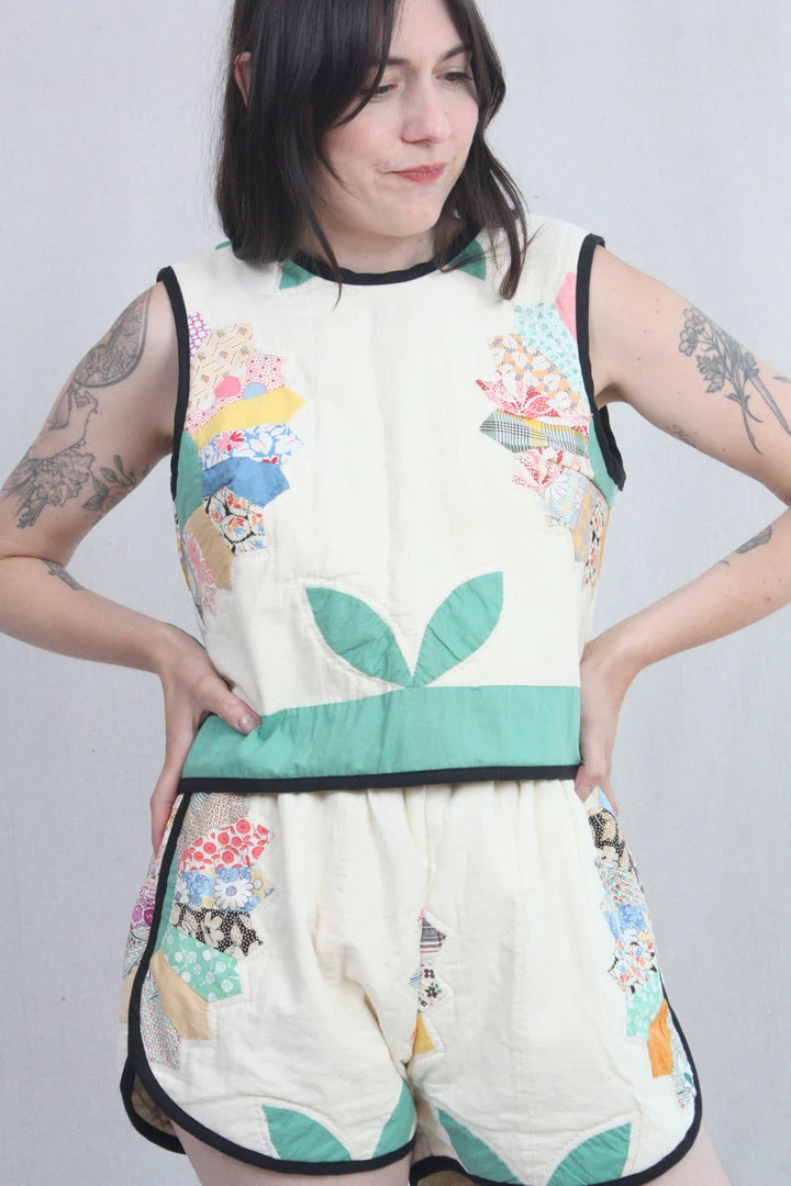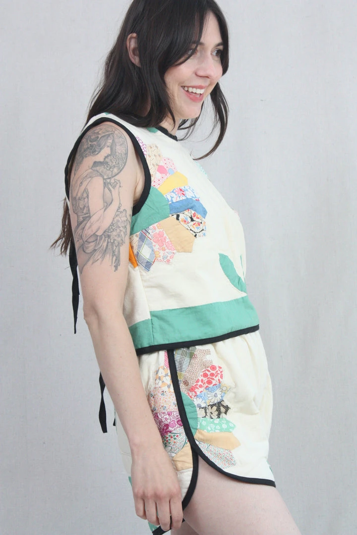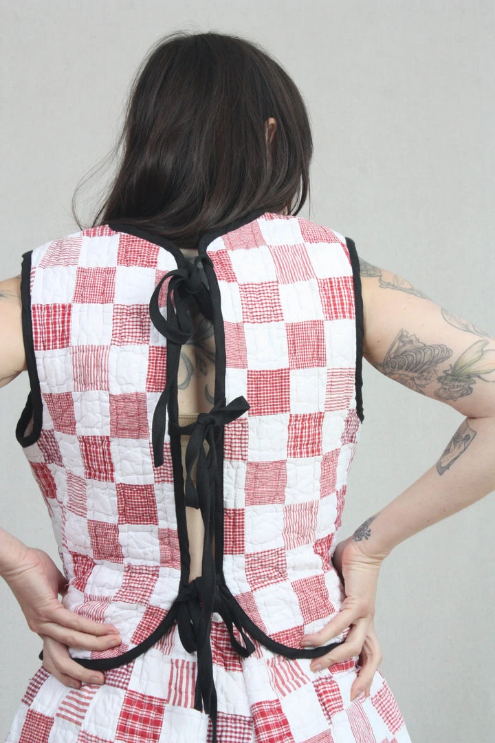 Versatile sleeveless top made from vintage quilt textiles. Can be worn by itself or layered over a long sleeve shirt. Black linen binding and ties at the back (but customers have been known to wear it backwards too!). This shell features one of a kind textiles that are hand picked. They may include wear, distress, marks, and other signs of age that add to the character of the finished garment.