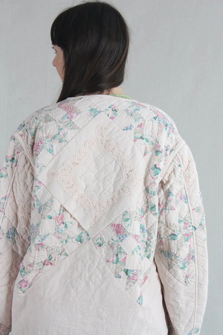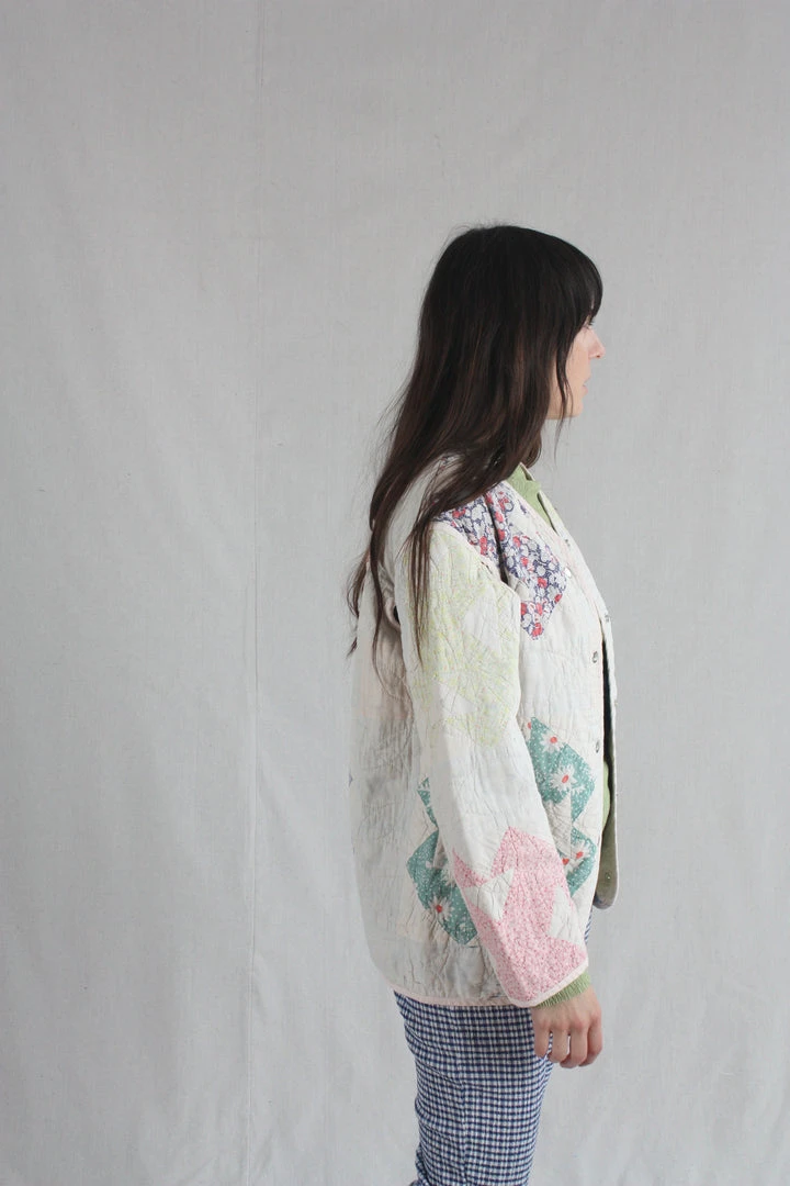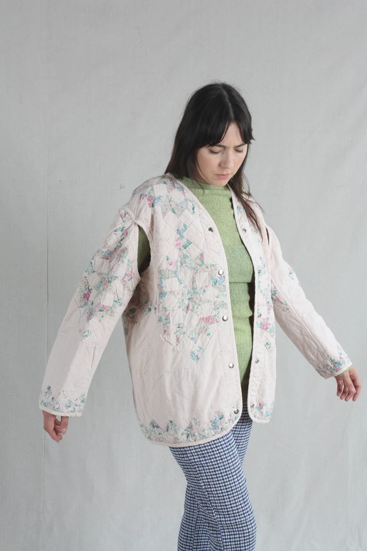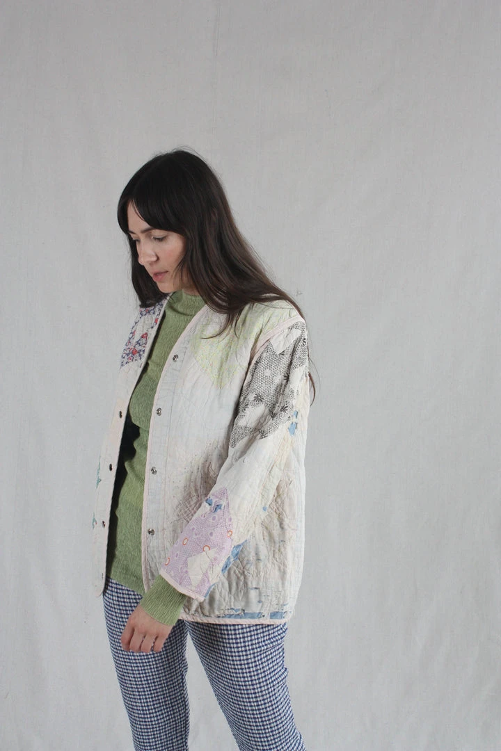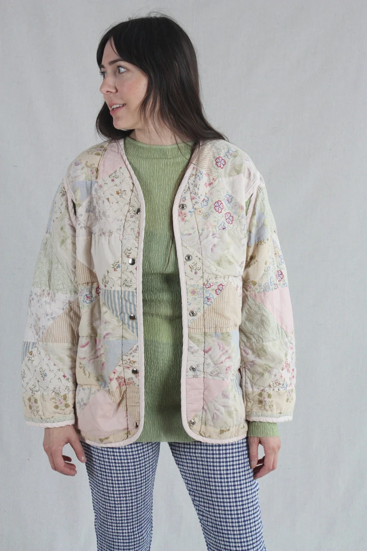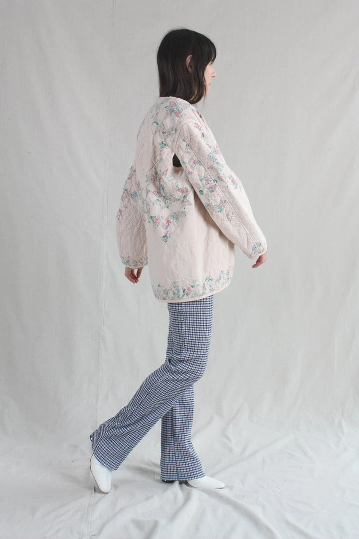Inspired by a classic flea market find, the army liner, Carleen’s Quilt Liner Jacket is upgraded, made from vintage quilts, with bound edges and garment dyed a soft rosy pink. White snap front closure. Each is completely unique, due to the variations in the vintage quilts. This jacket features one of a kind textiles that we hand picked by Carleen, that will include wear, distress, marks, and other signs of age adding character to the finished garment.