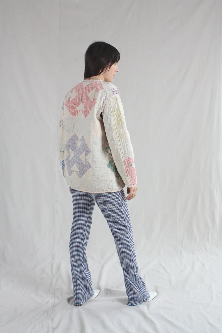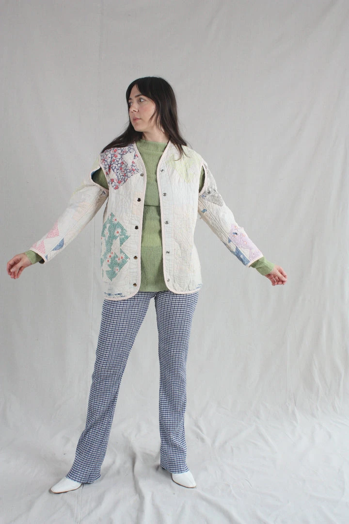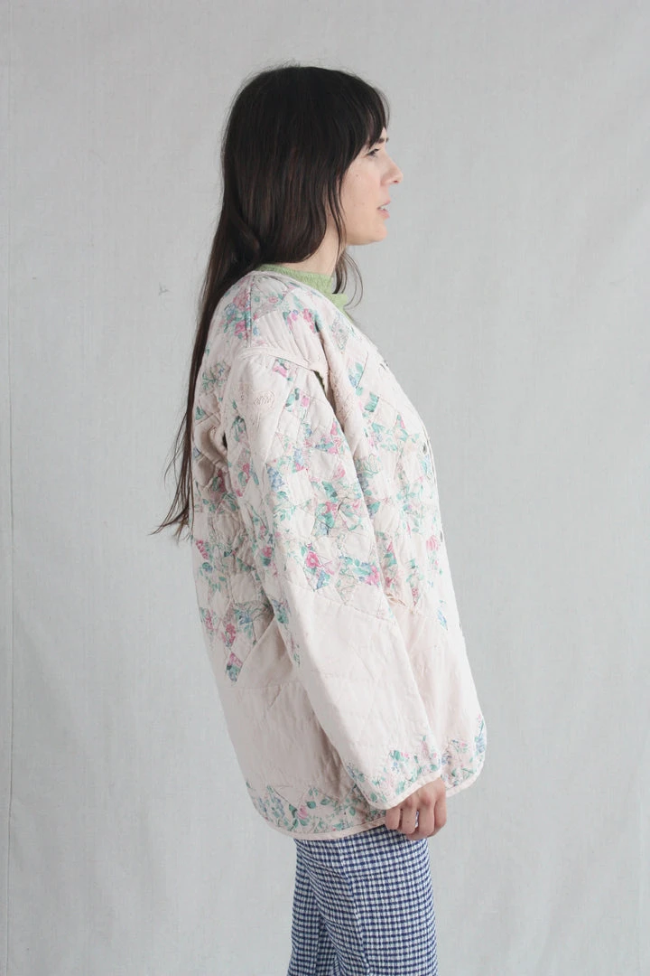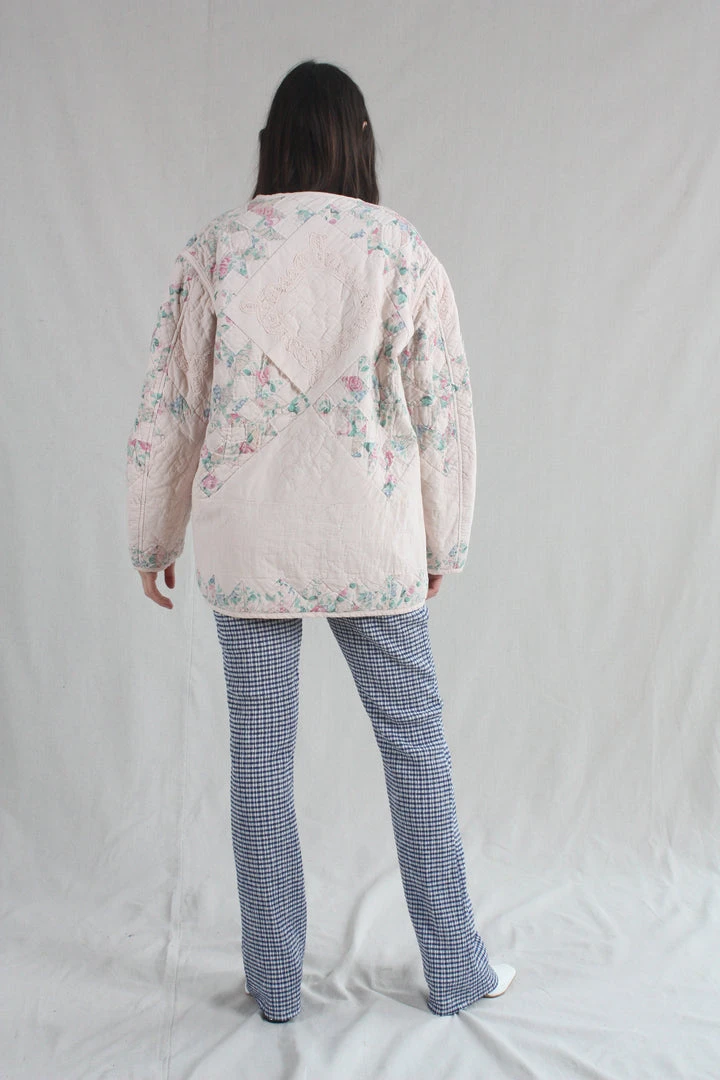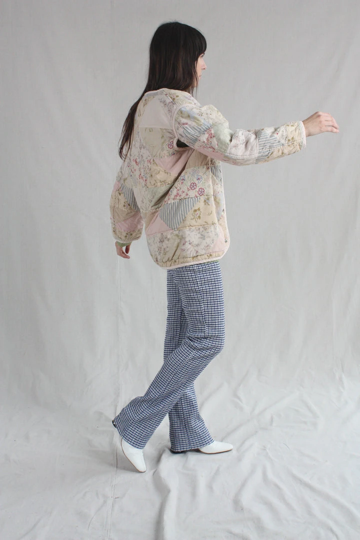 Inspired by a classic flea market find, the army liner, Carleen’s Quilt Liner Jacket is upgraded, made from vintage quilts, with bound edges and garment dyed a soft rosy pink. White snap front closure. Each is completely unique, due to the variations in the vintage quilts. This jacket features one of a kind textiles that we hand picked by Carleen, that will include wear, distress, marks, and other signs of age adding character to the finished garment.