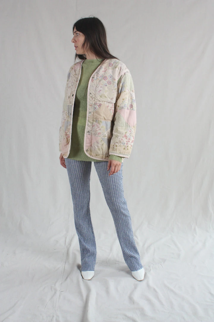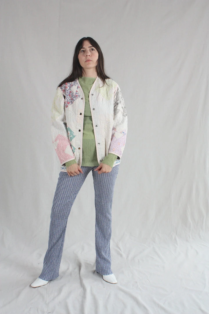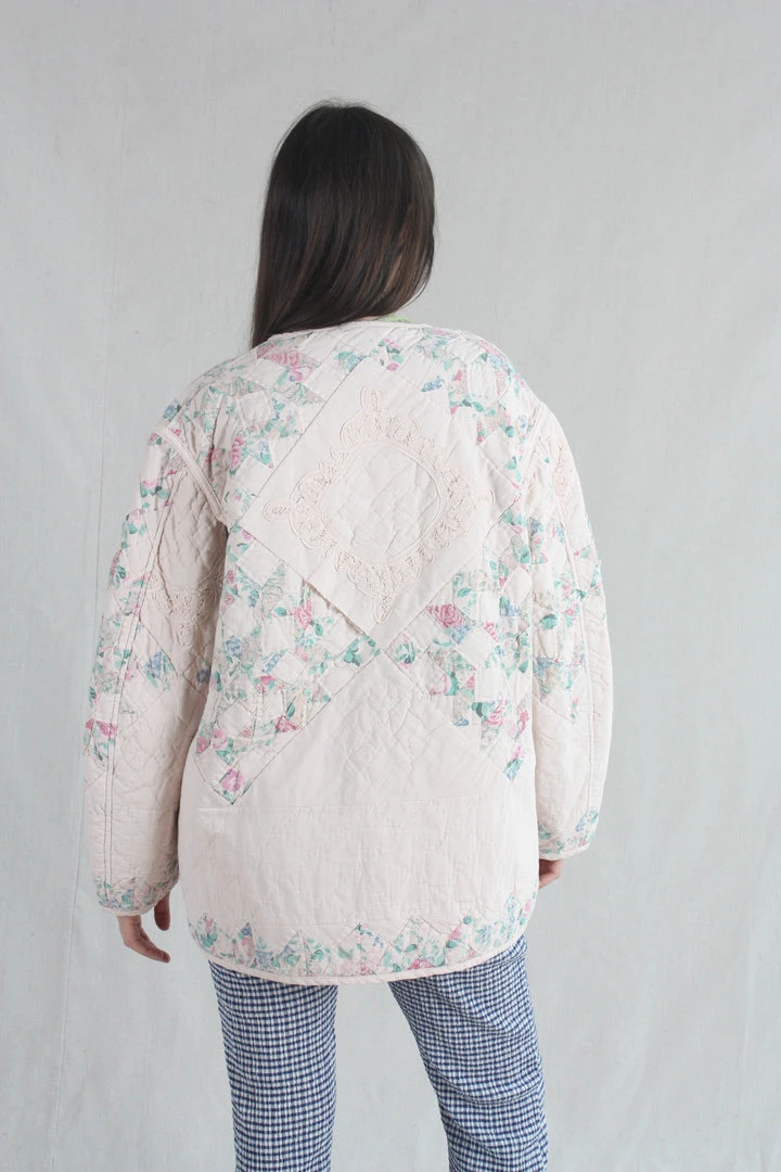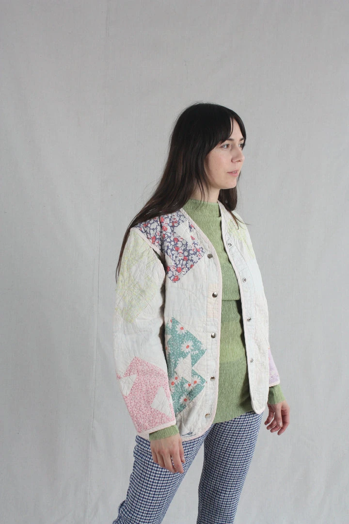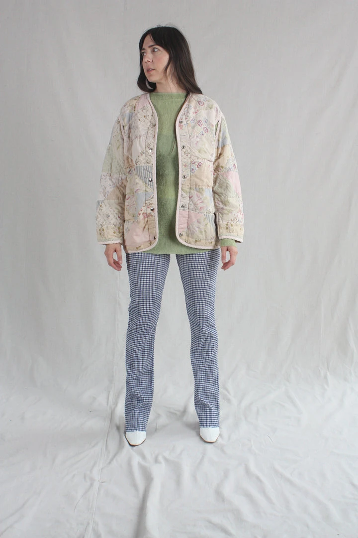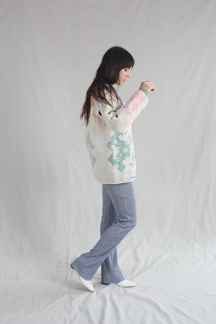 Inspired by a classic flea market find, the army liner, Carleen’s Quilt Liner Jacket is upgraded, made from vintage quilts, with bound edges and garment dyed a soft rosy pink. White snap front closure. Each is completely unique, due to the variations in the vintage quilts. This jacket features one of a kind textiles that we hand picked by Carleen, that will include wear, distress, marks, and other signs of age adding character to the finished garment.