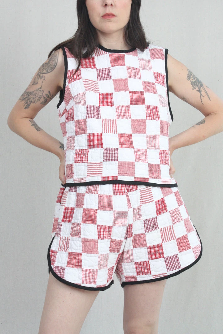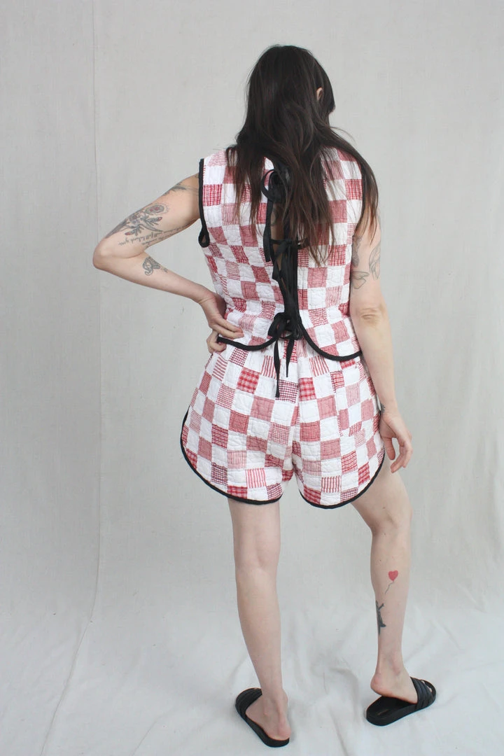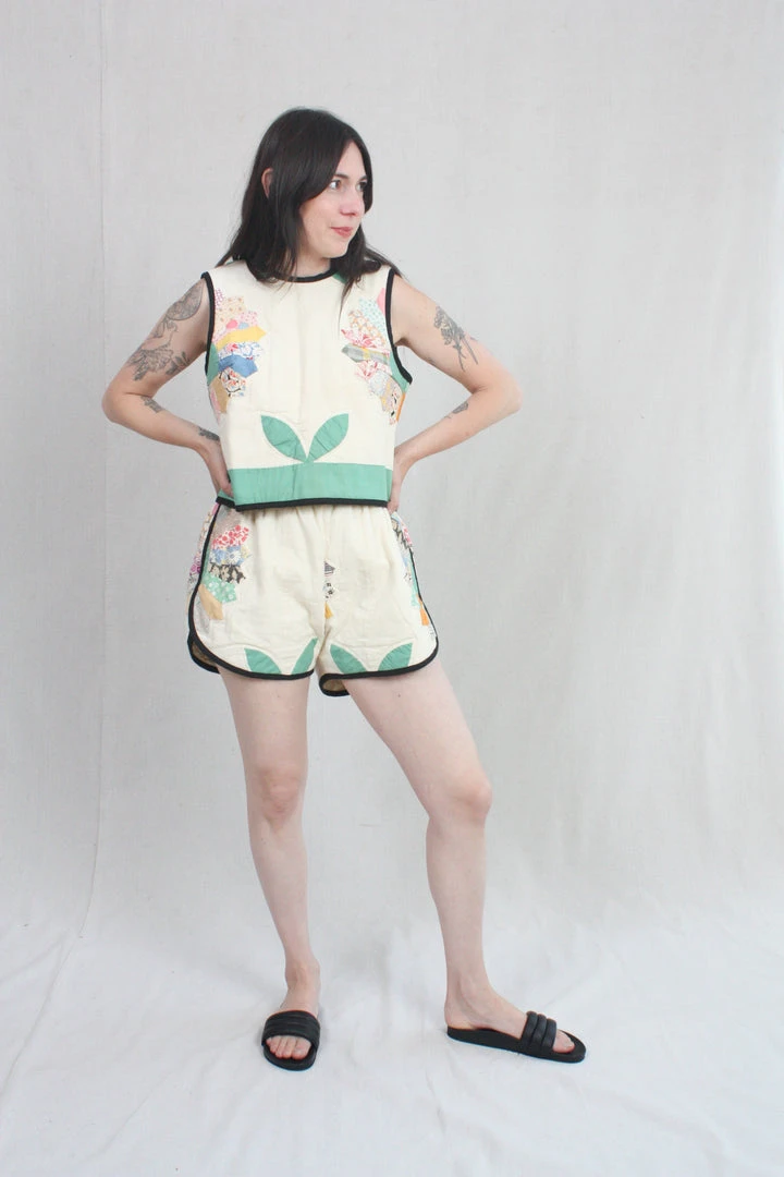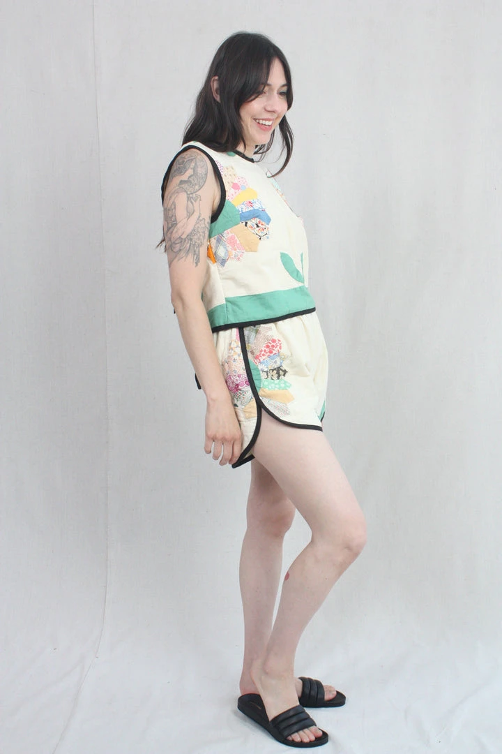 The cutest quilt shorts that ever lived, with black linen bound edges, a single back pocket, and elastic waist. Wear with matching Quilt Shell or a simple tee. These shorts feature one of a kind textiles that are hand picked. They may include wear, distress, marks, and other signs of age that add to the character of the finished garment.