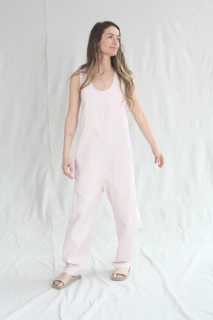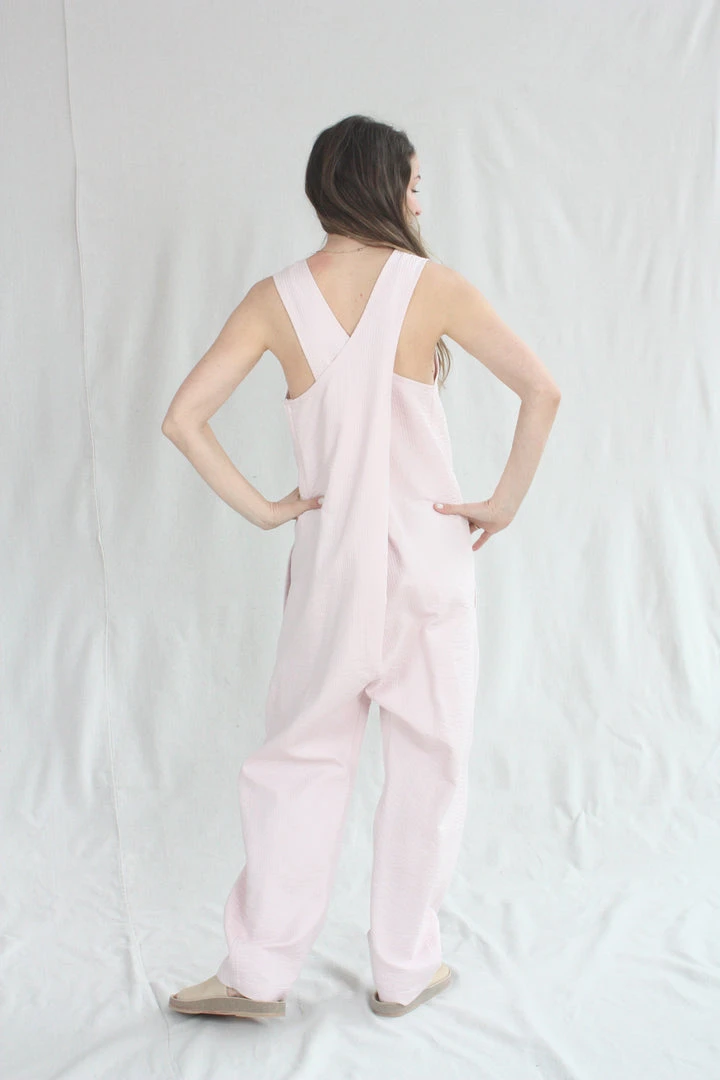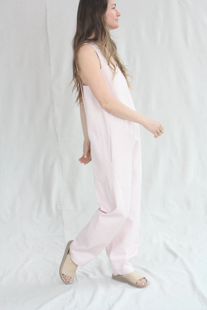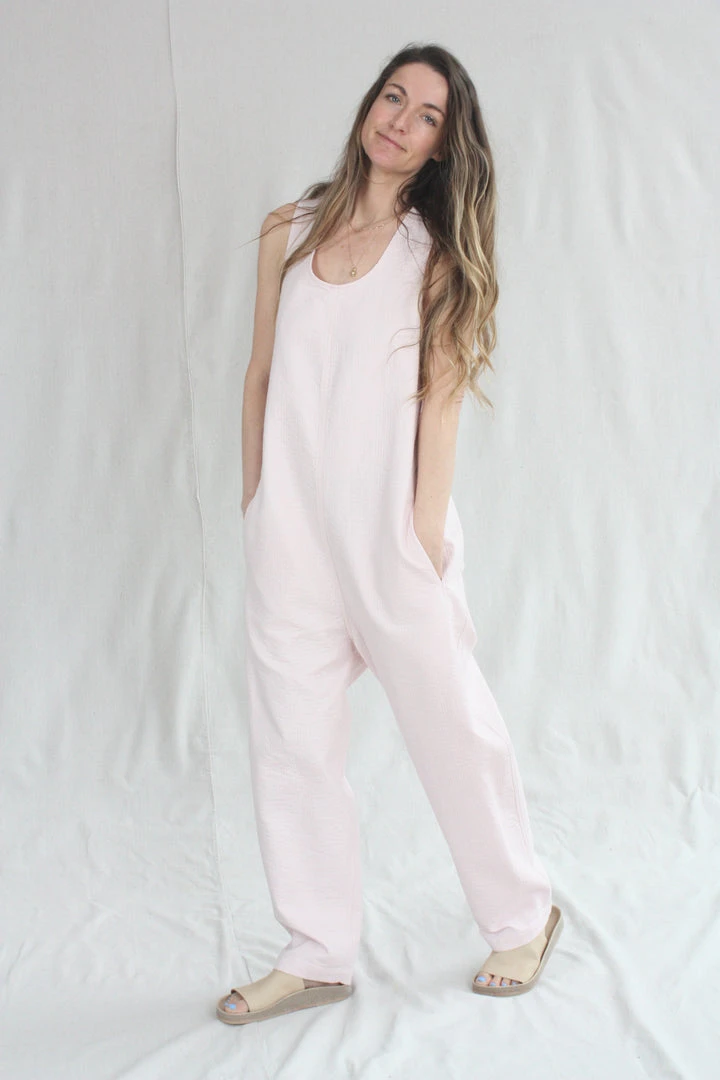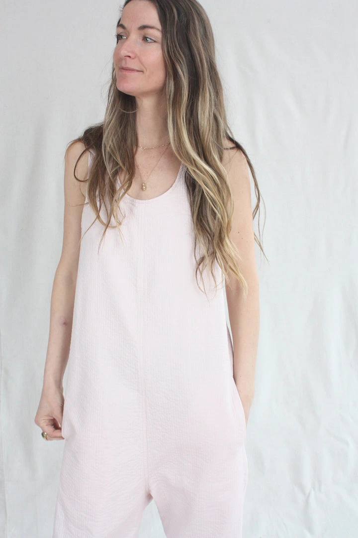 The Crista Jumpsuit is an easy and loose fit tank jumpsuit. Generous cut with criss cross back, this sleeveless jumpsuit is perfect for layering or wearing on its own. Features a crew neck with a slight dropped crotch and side pockets. Running stitch throughout the fabric creates a quilted effect.