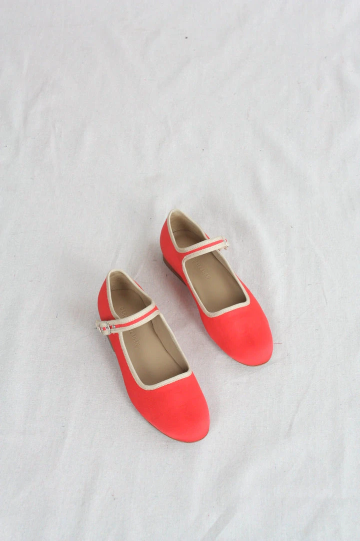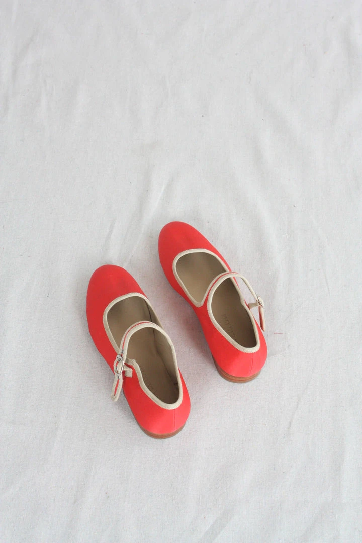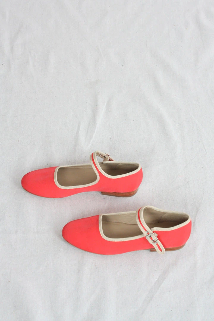 A classic Mary Jane in coral nylon and sand trim with adjustable brass buckle closure and contrast binding. Leather sole with 3/4″ block heel.  Natural leather insoles.