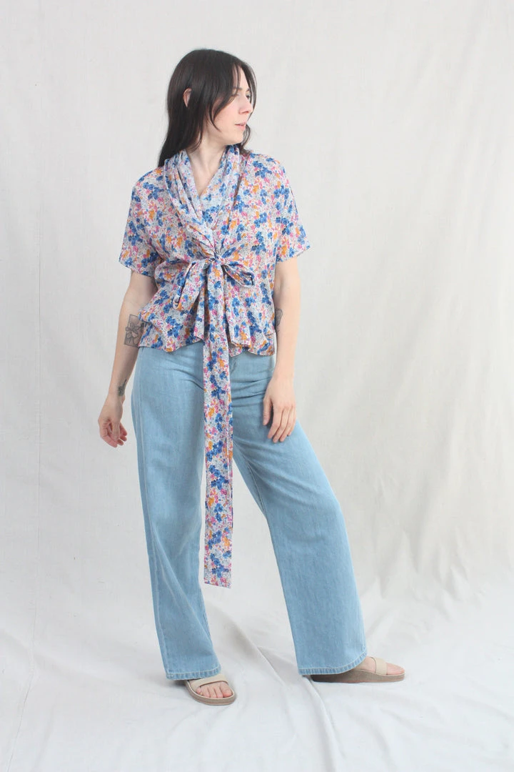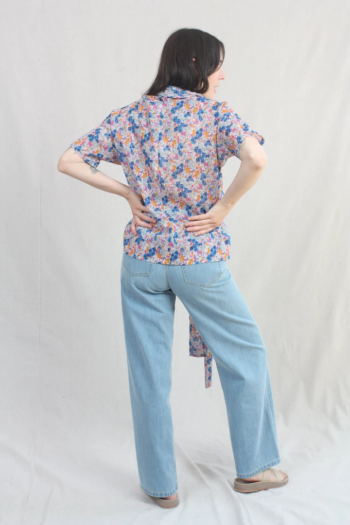 The Julien Top is a playful and unique take on an everyday blouse. Features a scarf neckline with a waist tie closure. Made in an apricot posy voile.