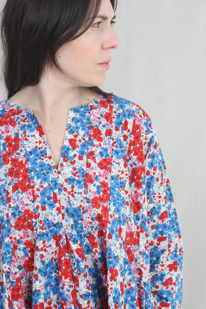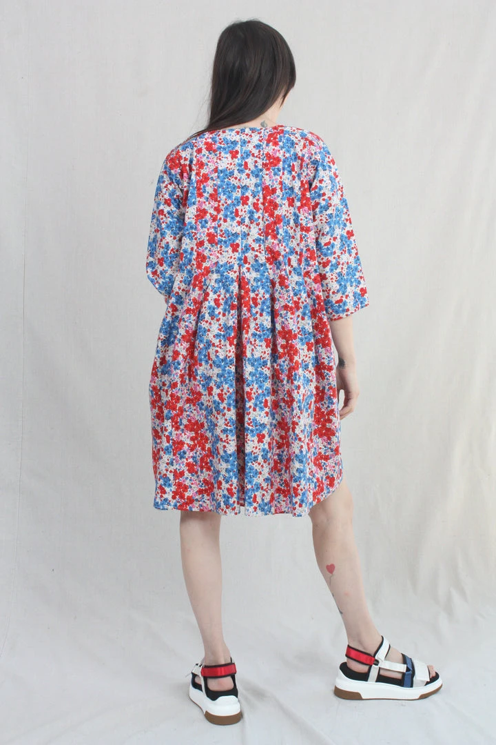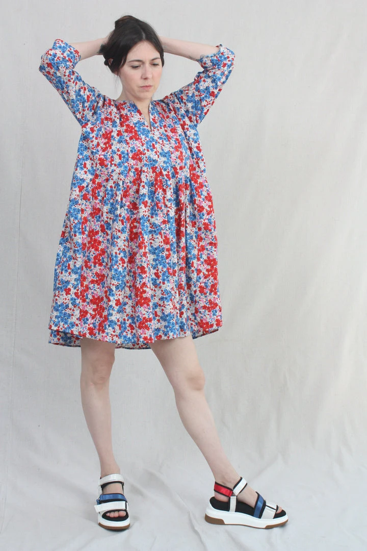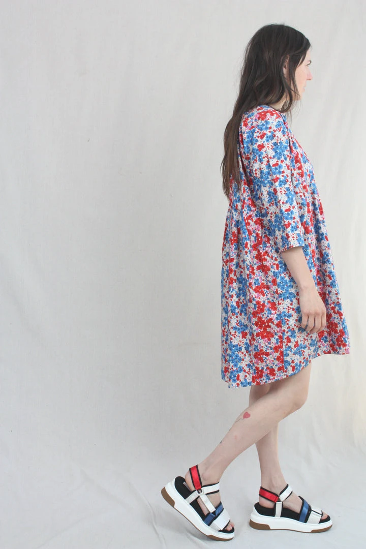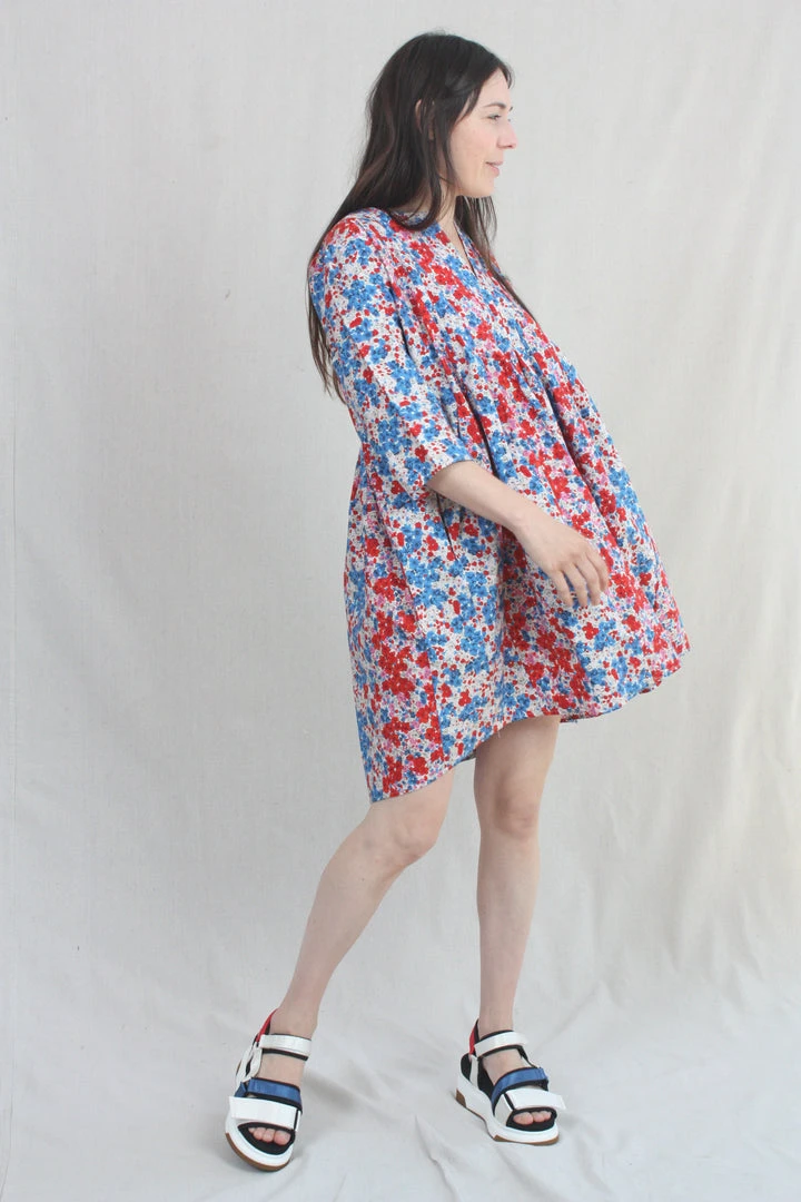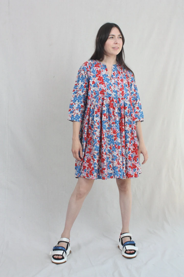 The Aria Dress is paneled, subtly pleated with a full skirt and the hem hitting just above the knee. Made in lightweight poplin florals, the Aria Dress is ideal for layering going into the warmer months. Features 3/4 length sleeves, and side seam pockets. Shorter than our typical dress, Aria can be styled over pants or worn on its own.