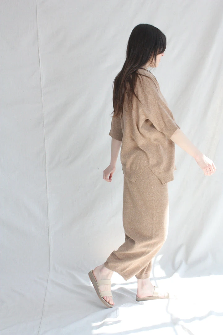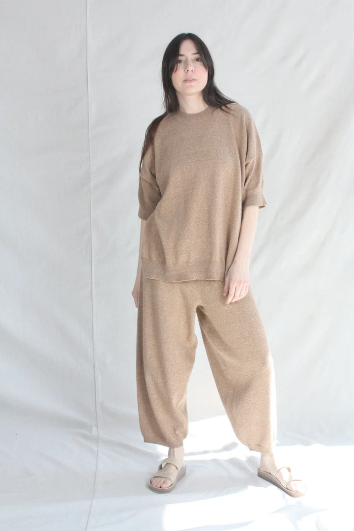 A comfy essentia with a loose fit for easy year round wear. Ribbed round neck, short sleeves and side openings. Light structure, soft texture. This knitted t-shirt is ethically and carefully manufactured in La Coruña, with Japanese knitting machines and finished by hand. Cordera uses yarn with certified traceability and a production cycle that minimizes their environmental impact.