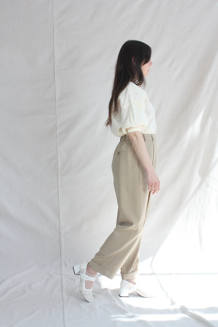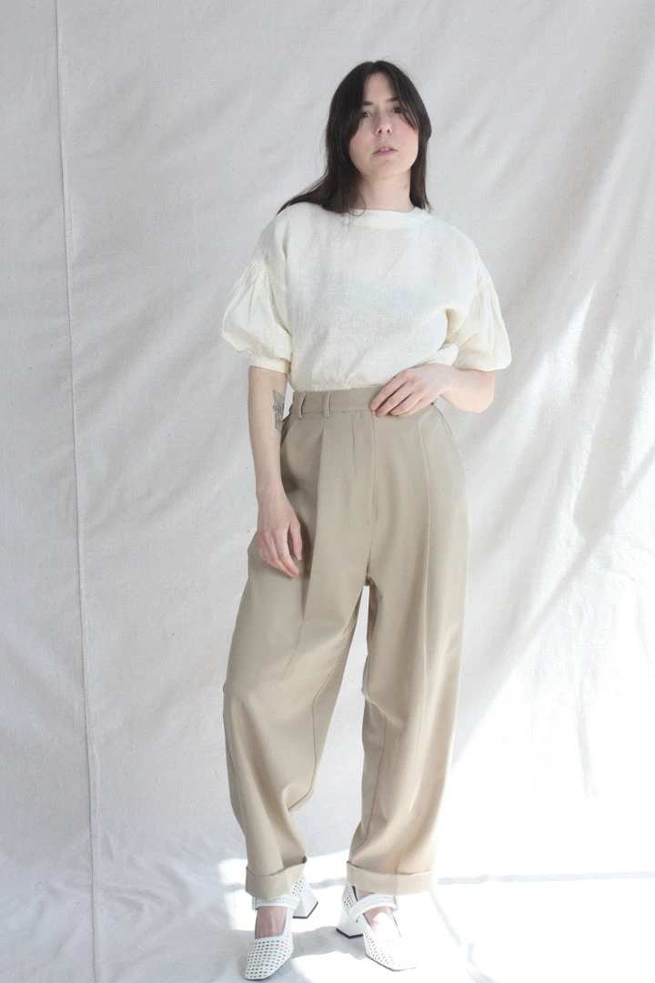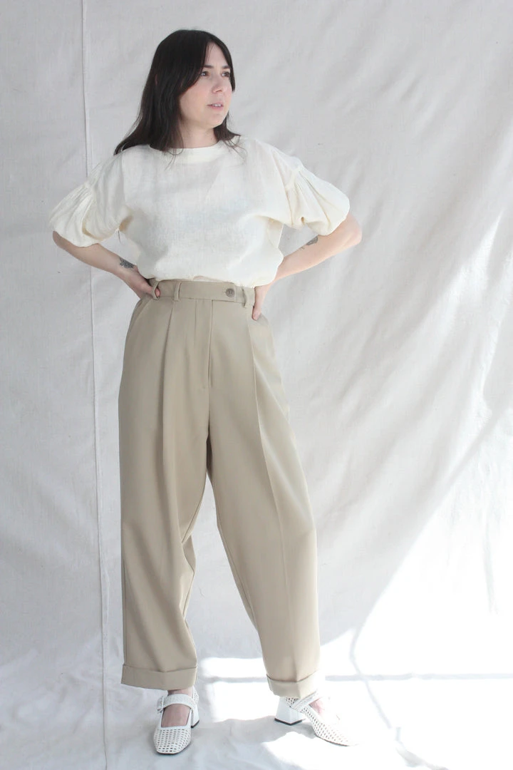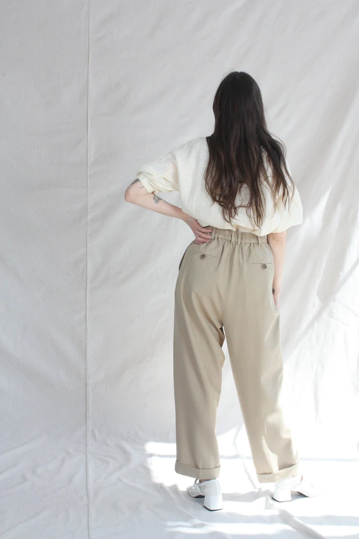 Timeless yet modern, classic oversized shape designed for easy wear year round. Elasticated waistband at the back, high rise and full-length leg with front pleat. These pants are ethically and carefully manufactured in La Coruña, crafted from high quality fabric and dyed locally with the latest technology and sustainable methods.