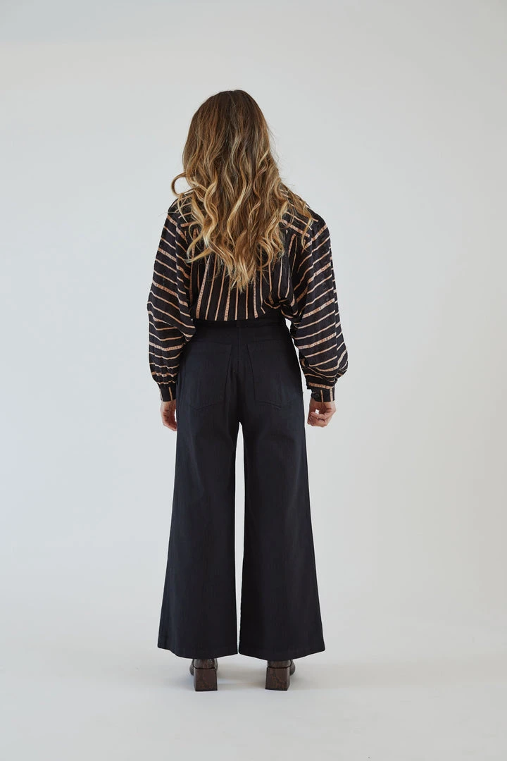 This cargo trouser is cut from a structured and soft mid weight twill that has a classic workwear herringbone stripe texture. The pant has a flattering high rise waist that is fitted through the hips and opens up to a crop wide leg. Styled with front and back utility pockets, classic topstitching, and closes with a corozo button at center front.
