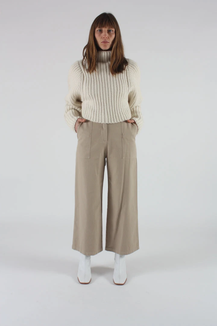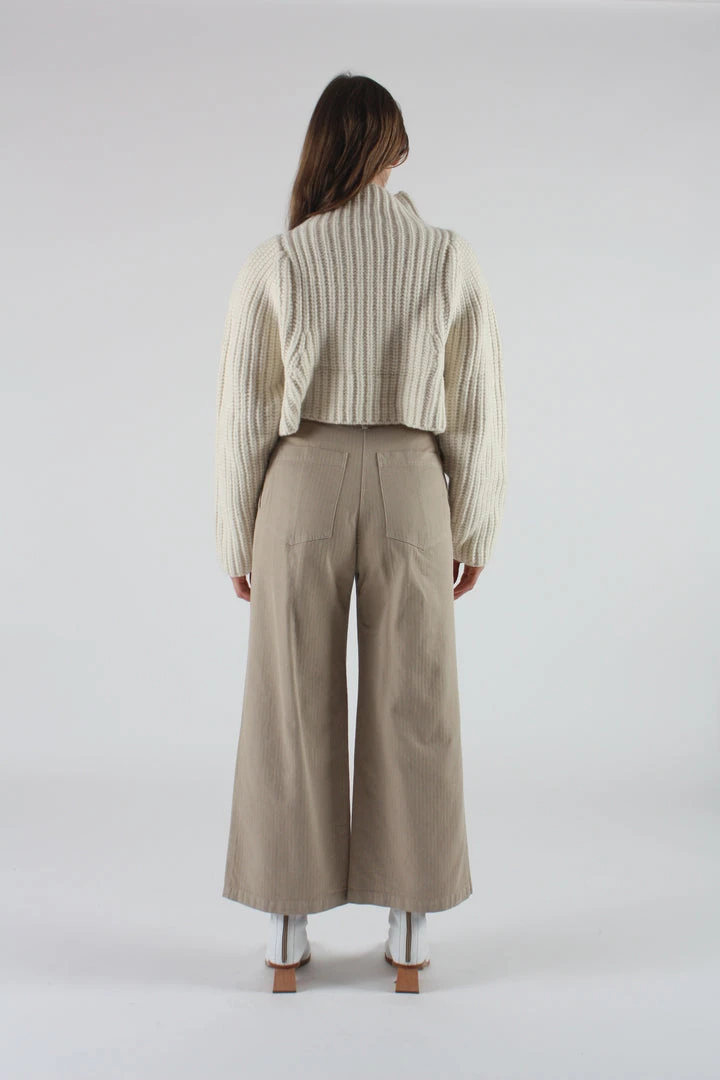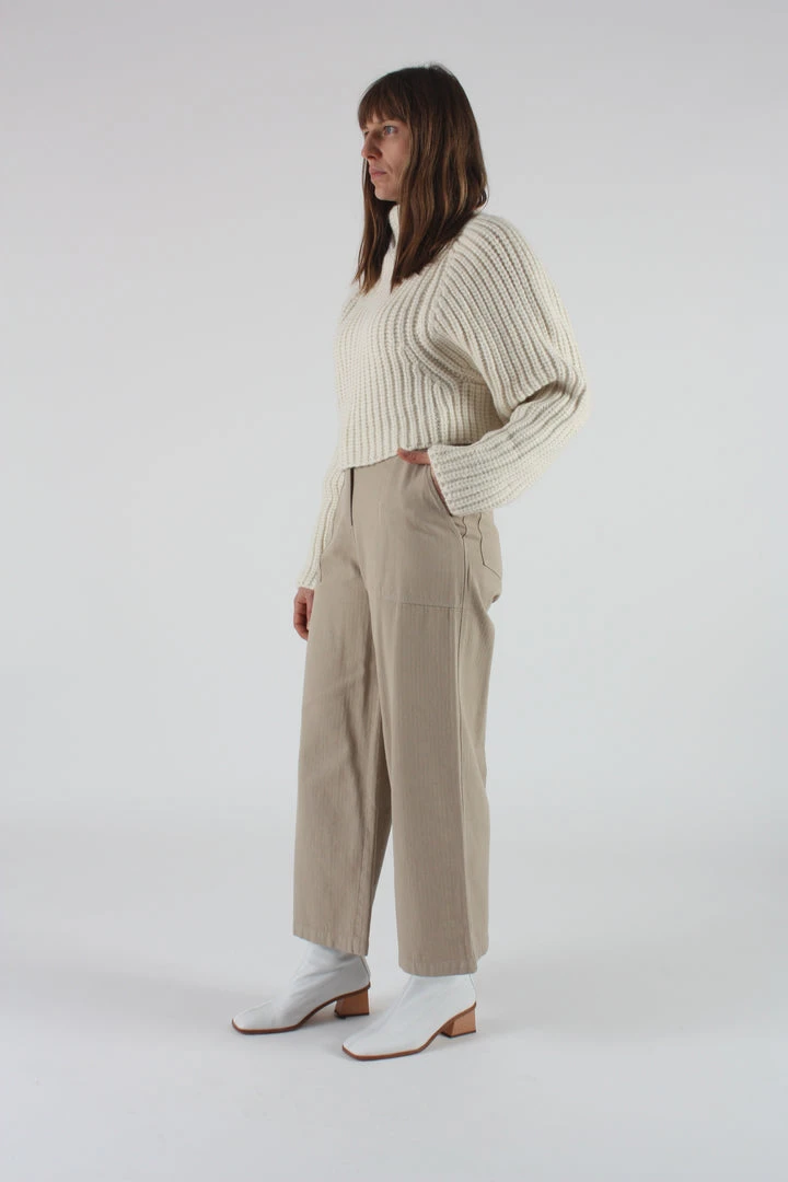 This cargo trouser is cut from a structured and soft mid weight twill that has a classic workwear herringbone stripe texture. The pant has a flattering high rise waist that is fitted through the hips and opens up to a crop wide leg. Styled with front and back utility pockets, classic topstitching, and closes with a corozo button at center front.