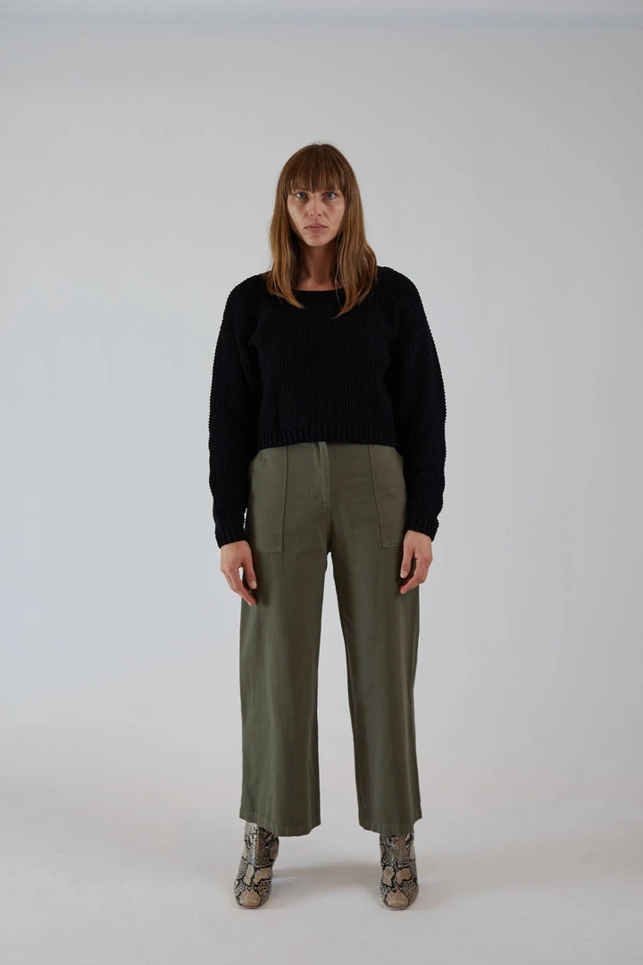 This cargo trouser is cut from a structured and soft mid weight twill that has a classic workwear herringbone stripe texture. The pant has a flattering high rise waist that is fitted through the hips and opens up to a crop wide leg. Styled with front and back utility pockets, classic topstitching, and closes with a corozo button at center front.
