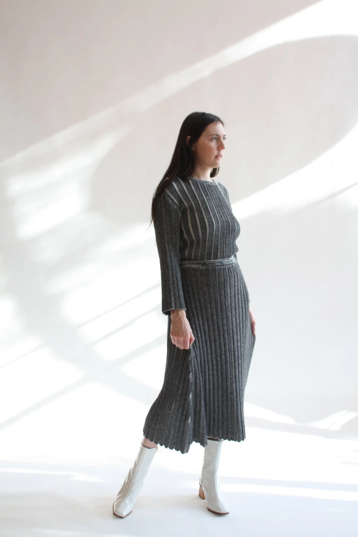 The Tulip Sweater is knit from a soft alpaca modal blend in wide contrast pleats that open and close as you move throughout your day to create beautiful movement. Styled with a cropped bell sleeve and slight a line fit. Pair it with the Tulip Skirt for a perfect set.
